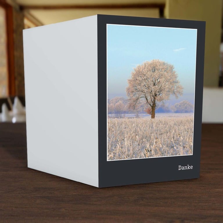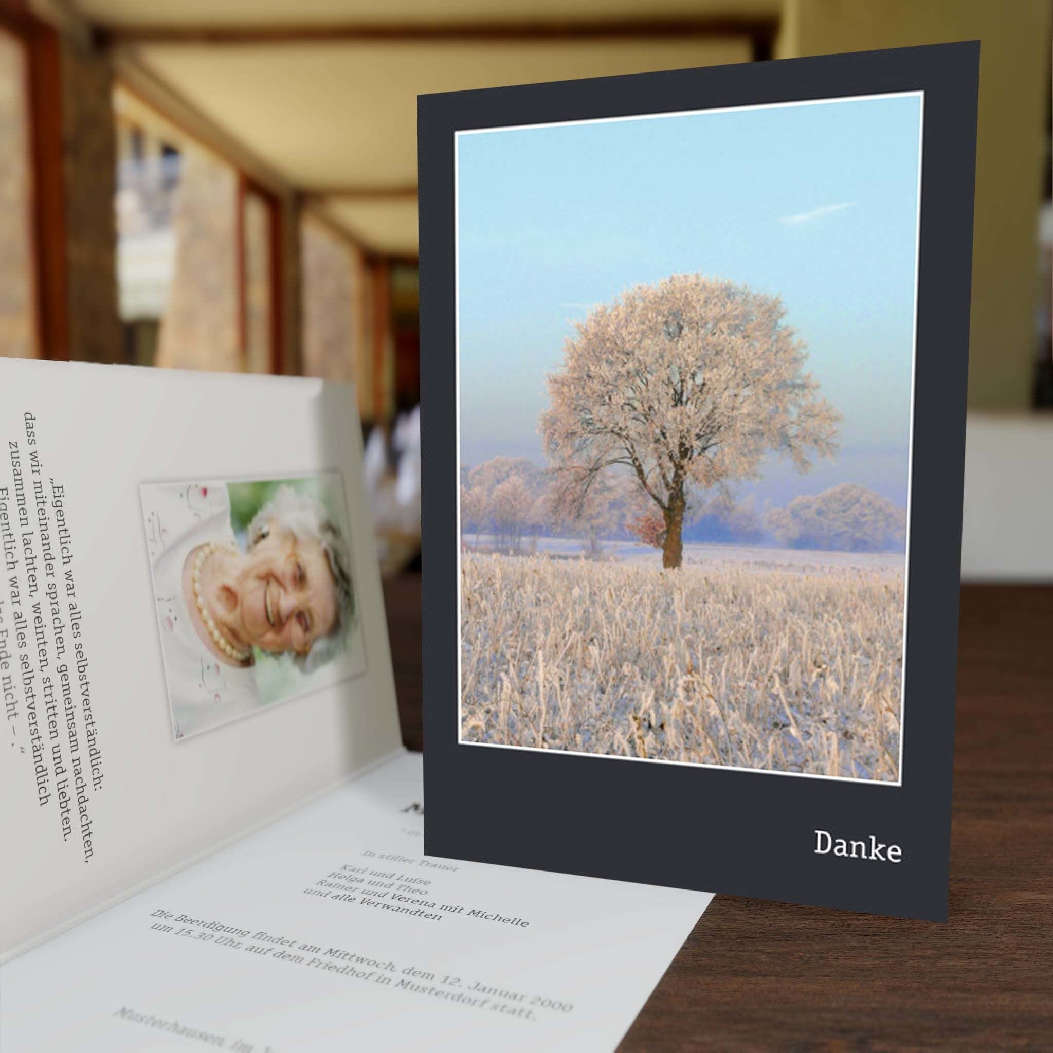 Trauer Danksagung mit Winterbaum im klassischen Hochformat. Für liebe Menschen, die Ihnen in schwerer Zeit eine Stütze waren: die Danksagungskarte Winterbaum.