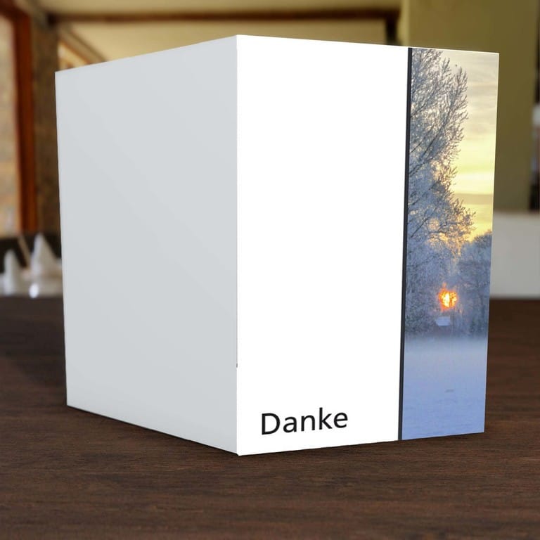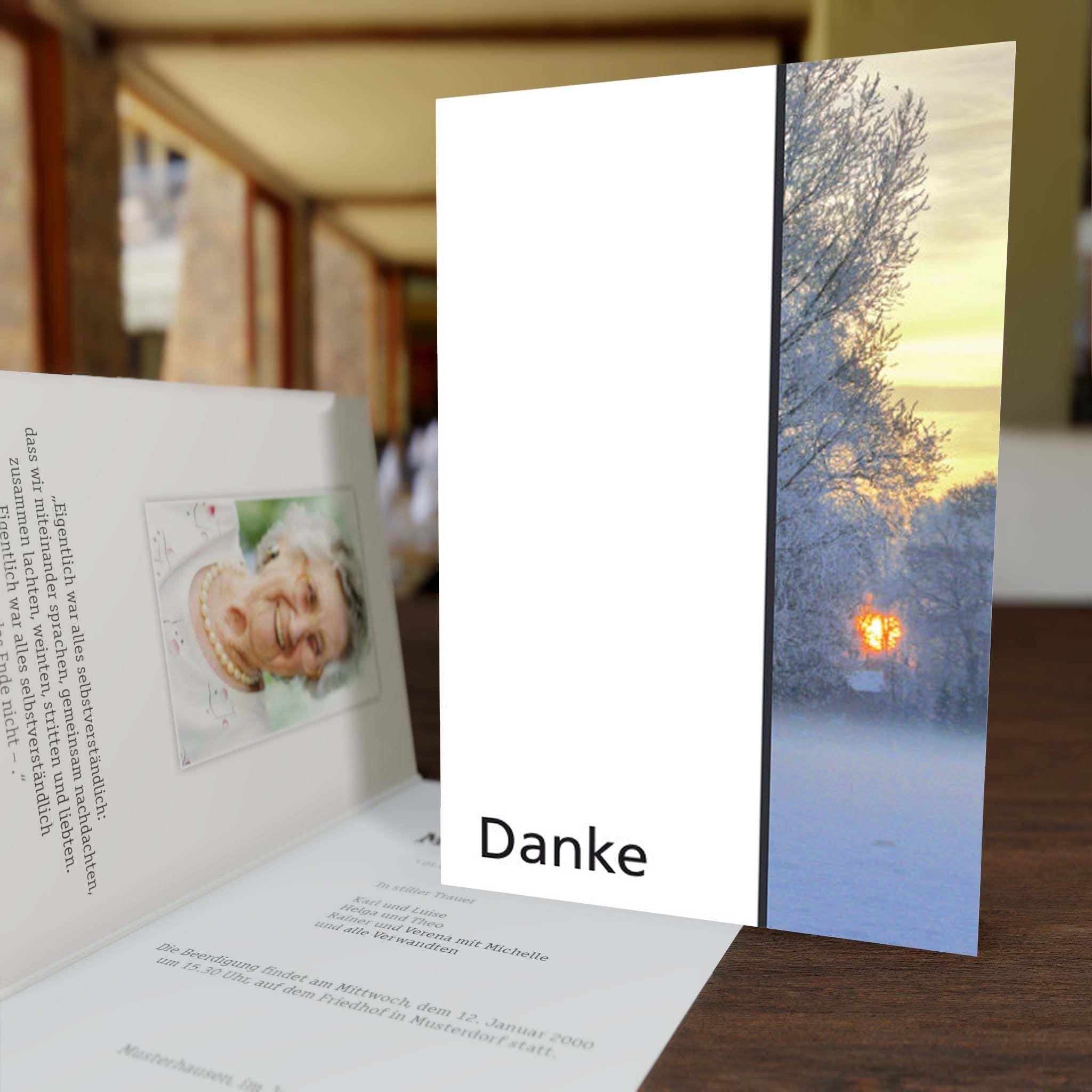 Trauer Danksagung mit Wintersonnenaufgang im klassischen Hochformat. Bedanken Sie sich stilvoll mit der Danksagungskarte „Wintersonnenaufgang“ für die erwiesene Anteilnahme,