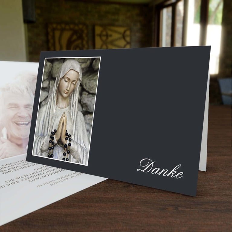 Stilvolle Trauerdanksagungskarte mit dem Motiv „Betende Madonna“.