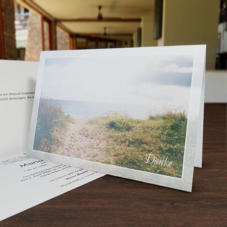 Bedanken Sie sich mit dieser Trauerkarte Danksagung „Dünen“ für die erwiesene Anteilnahme, den Trost und die Unterstützung jeglicher Art in der Zeit der Trauer.