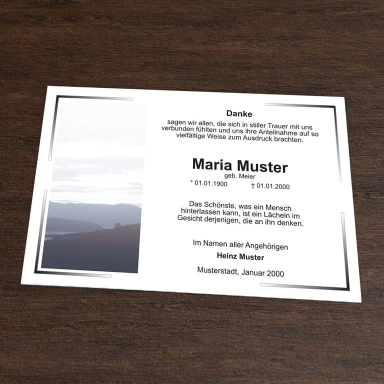 Trauerdanksagung mit dem Motiv „Bergblick“ im klassischen einseitigem Querformat. Bedanken Sie sich stilvoll mit der Danksagungskarte „Bergblick“ für die erwiesene Anteilnahme, den Trost und die Unterstützung jeglicher Art in der Zeit der Trauer.