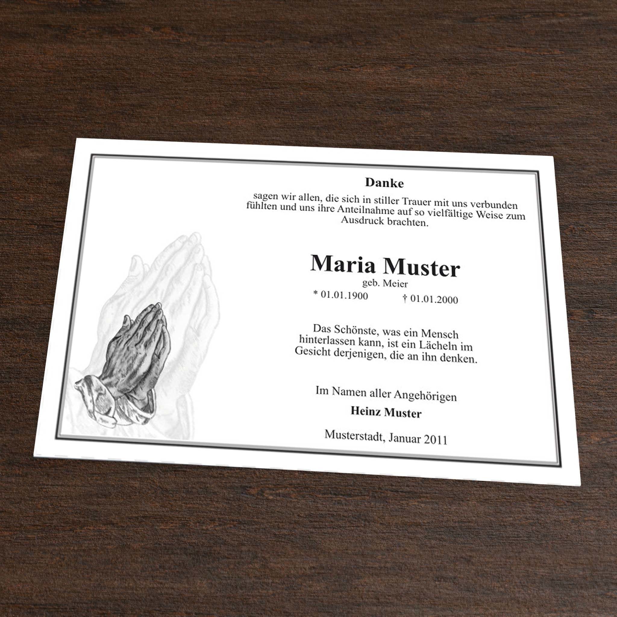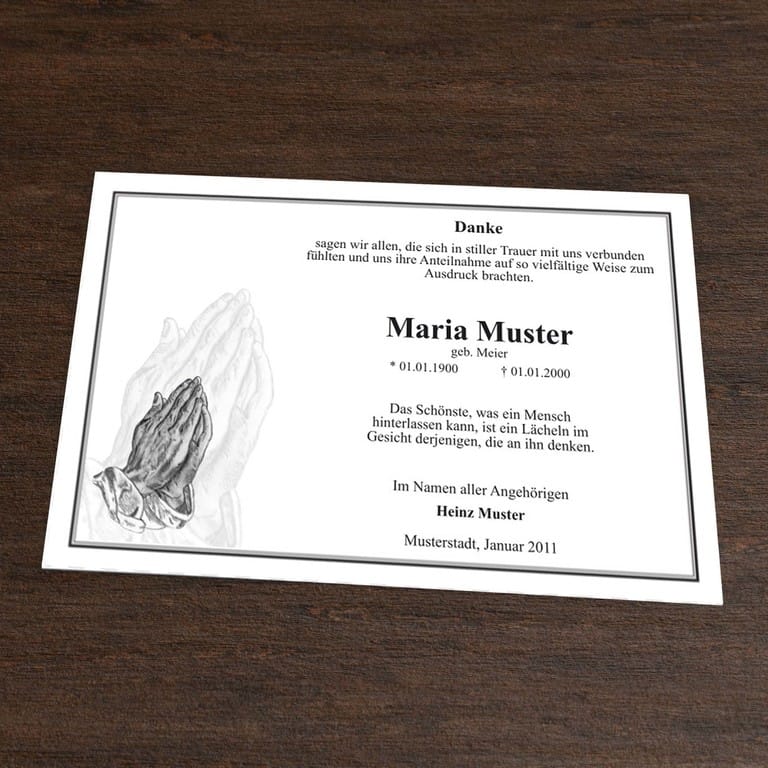 Trauerdanksagung mit dem Motiv "Betende Hände" schwarz weiß im klassischen einseitigem Querformat. Bedanken Sie sich stilvoll mit der Danksagungskarte „Betende Hände schwarz weiß“ für die erwiesene Anteilnahme, den Trost und die Unterstützung jeglicher Art in der Zeit der Trauer.