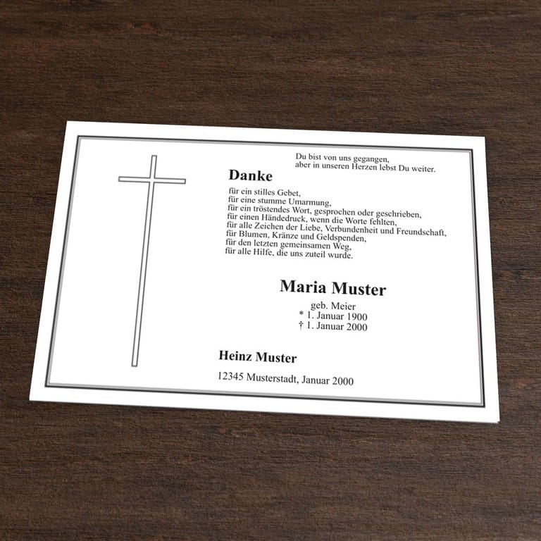 Trauerdanksagung mit dem Motiv Kreuz im klassischen einseitigem Querformat. Bedanken Sie sich stilvoll mit der Danksagungskarte „Kreuzkarte“ für die erwiesene Anteilnahme, den Trost und die Unterstützung jeglicher Art in der Zeit der Trauer.
