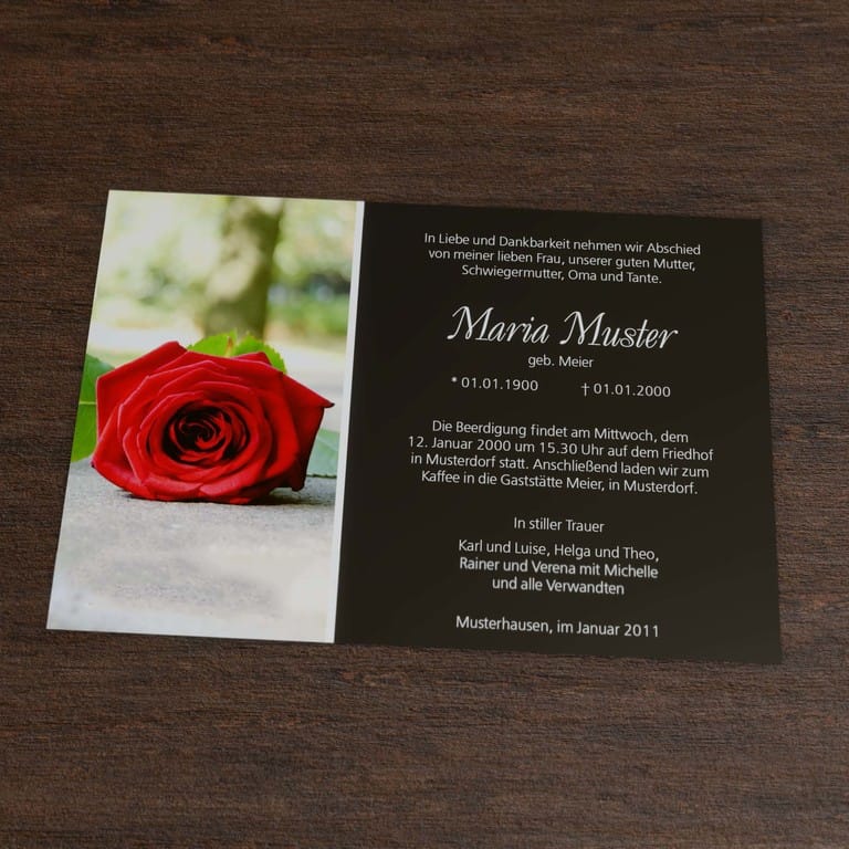 Trauerdanksagung mit dem Motiv liegende Rose im klassischen einseitigem Querformat. Bedanken Sie sich stilvoll mit der Danksagungskarte „Waldweg“ für die erwiesene Anteilnahme, den Trost und die Unterstützung jeglicher Art in der Zeit der Trauer.