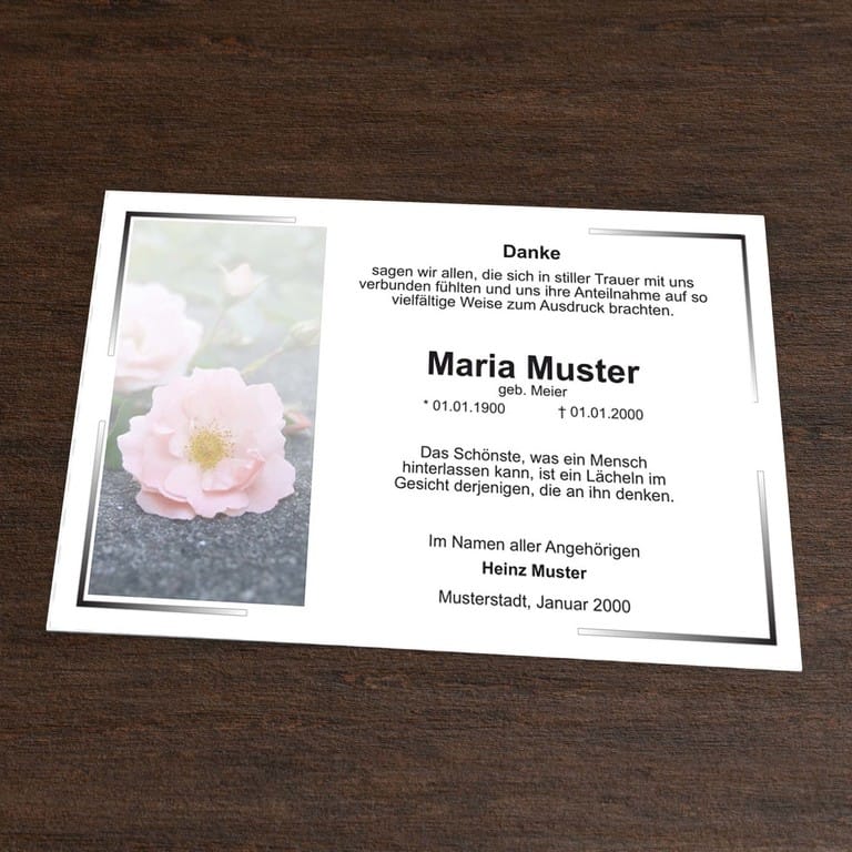 Diese Trauerdankkarte ist 2-seitig und wird individuell für Sie in Farbe gedruckt.