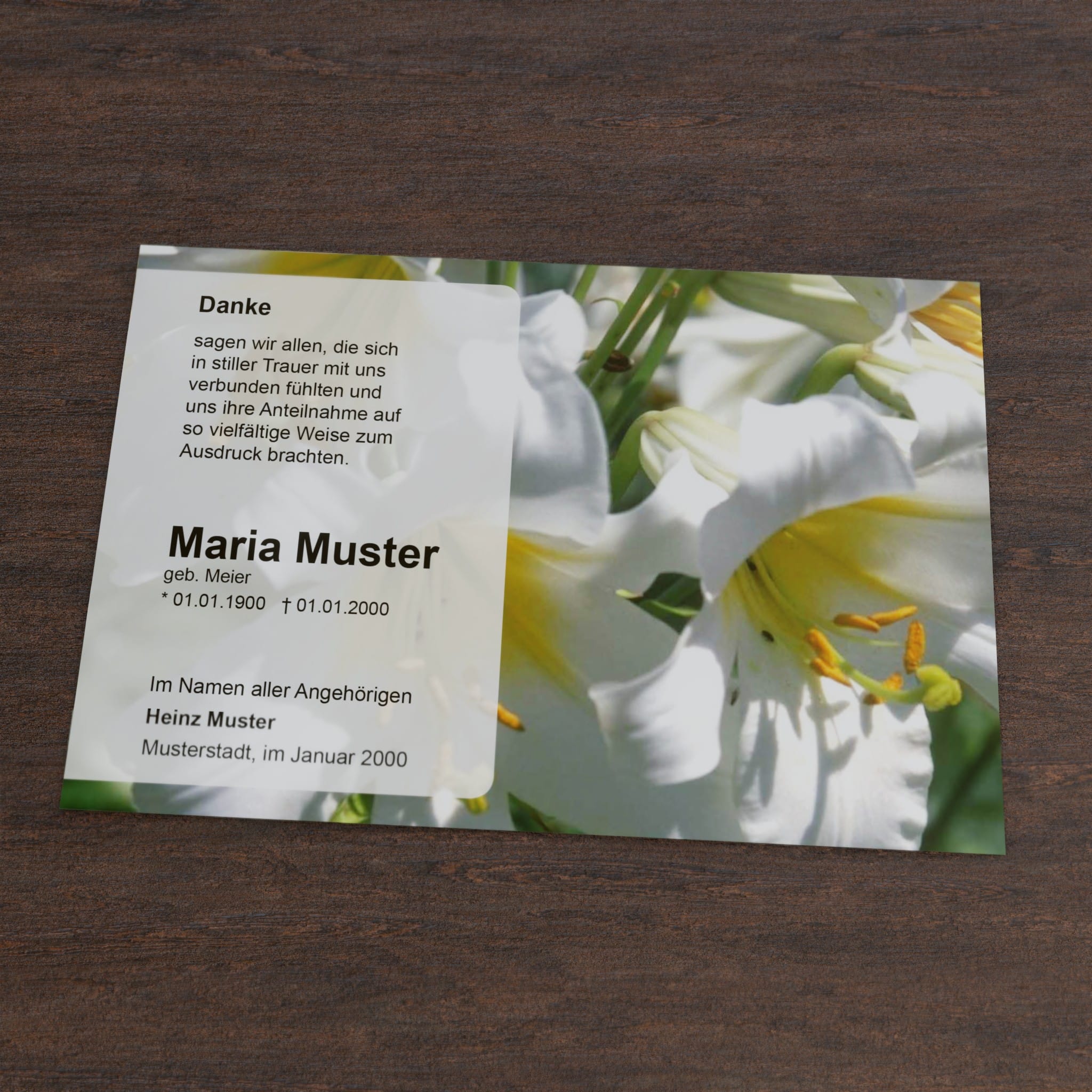 Trauerdanksagung mit dem Motiv weiße Lilien im klassischen einseitigem Querformat. Bedanken Sie sich stilvoll mit der Danksagungskarte „weiße Lilien“ für die erwiesene Anteilnahme, den Trost und die Unterstützung jeglicher Art in der Zeit der Trauer.