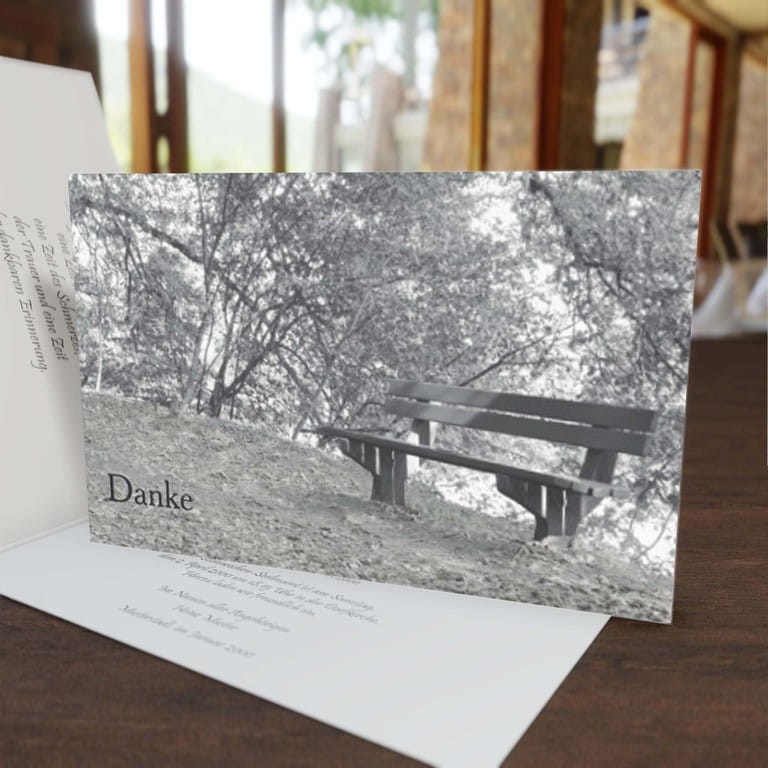 Bedanken Sie sich mit dieser Trauerkarte Danksagung „Bank“ für die erwiesene Anteilnahme, den Trost und die Unterstützung jeglicher Art in der Zeit der Trauer.