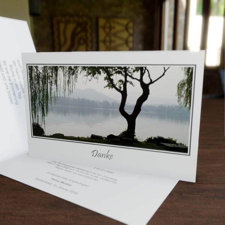 Bedanken Sie sich mit dieser Trauerkarte Danksagung „Baum am Wasser“ für die erwiesene Anteilnahme, den Trost und die Unterstützung jeglicher Art in der Zeit der Trauer.