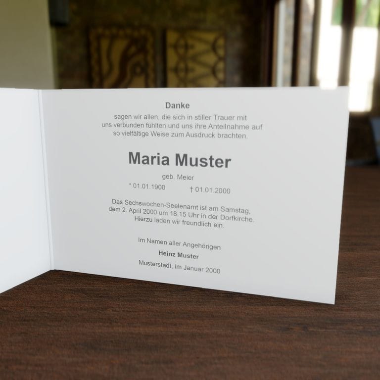 Diese Trauerdankkarte ist 4-seitig und wird individuell für Sie in Farbe gedruckt.