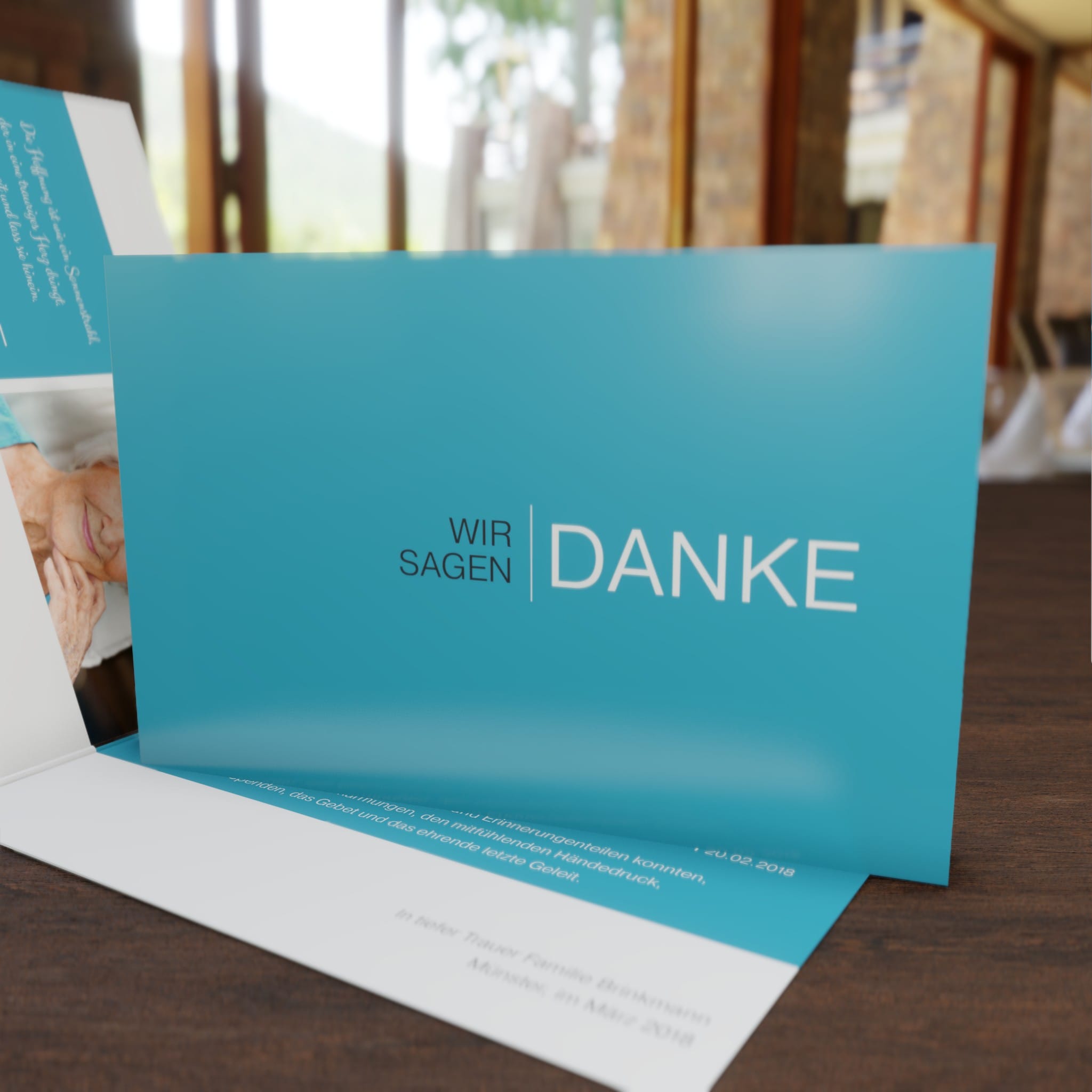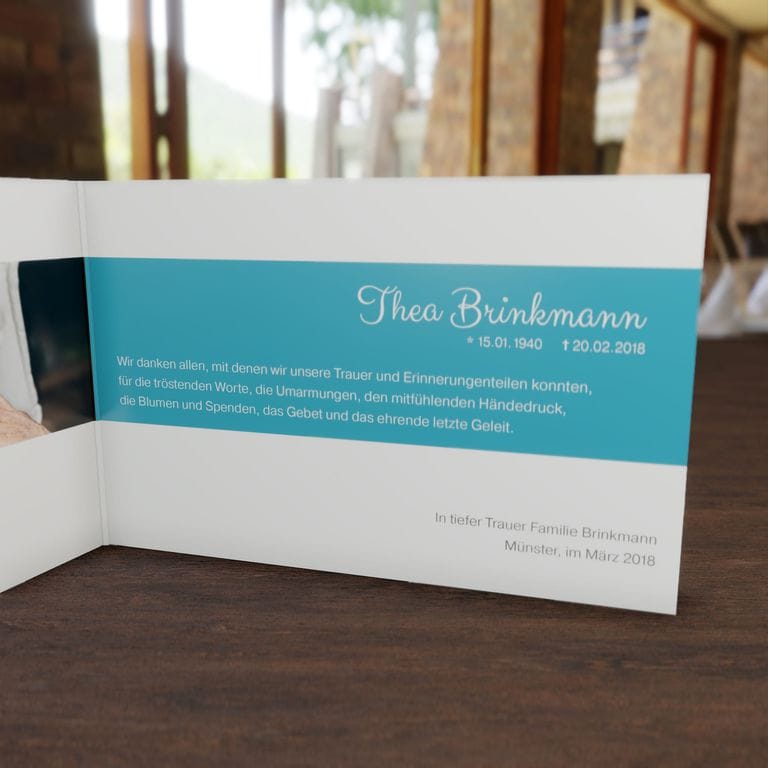 Diese Trauerdankkarte ist 4-seitig und wird individuell für Sie in Farbe gedruckt.