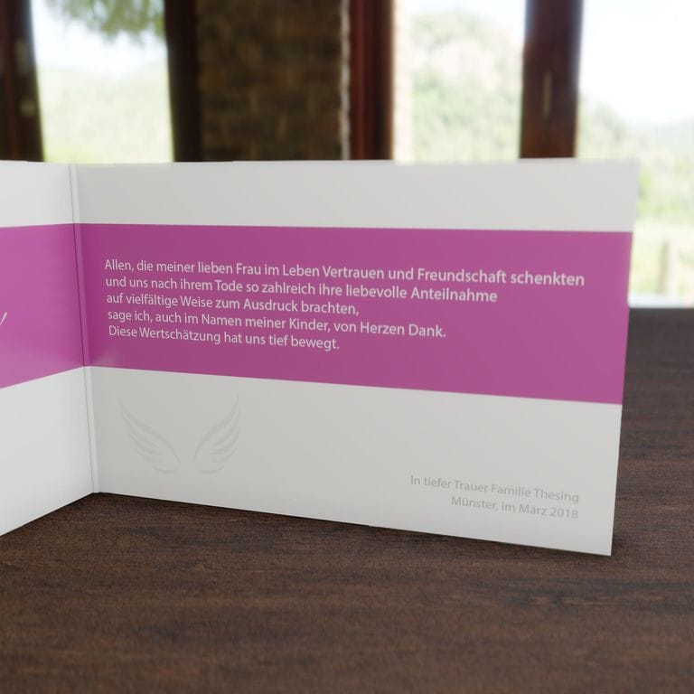 Bedanken Sie sich mit dieser Trauerkarte Danksagung „Engelsflügel“ für die erwiesene Anteilnahme, den Trost und die Unterstützung jeglicher Art in der Zeit der Trauer.