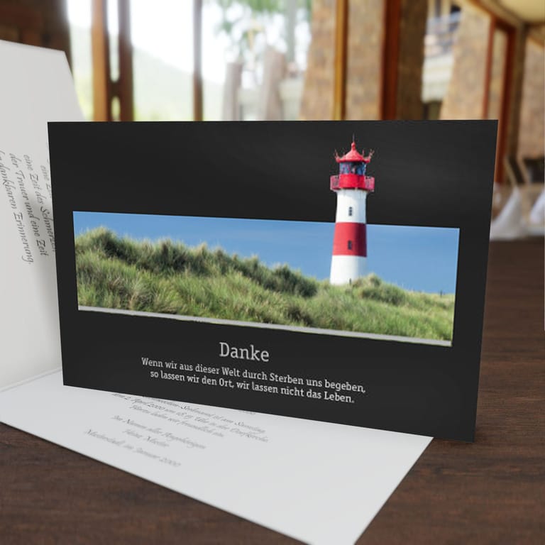Bedanken Sie sich mit dieser Trauerkarte Danksagung „Leuchtturm“ für die erwiesene Anteilnahme, den Trost und die Unterstützung jeglicher Art in der Zeit der Trauer.