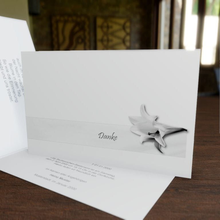 Bedanken Sie sich mit dieser Trauerkarte Danksagung „Lilie liegend“ für die erwiesene Anteilnahme, den Trost und die Unterstützung jeglicher Art in der Zeit der Trauer.