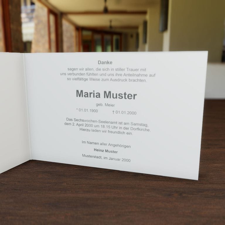 Diese Trauerdankkarte ist 4-seitig und wird individuell für Sie in Farbe gedruckt.