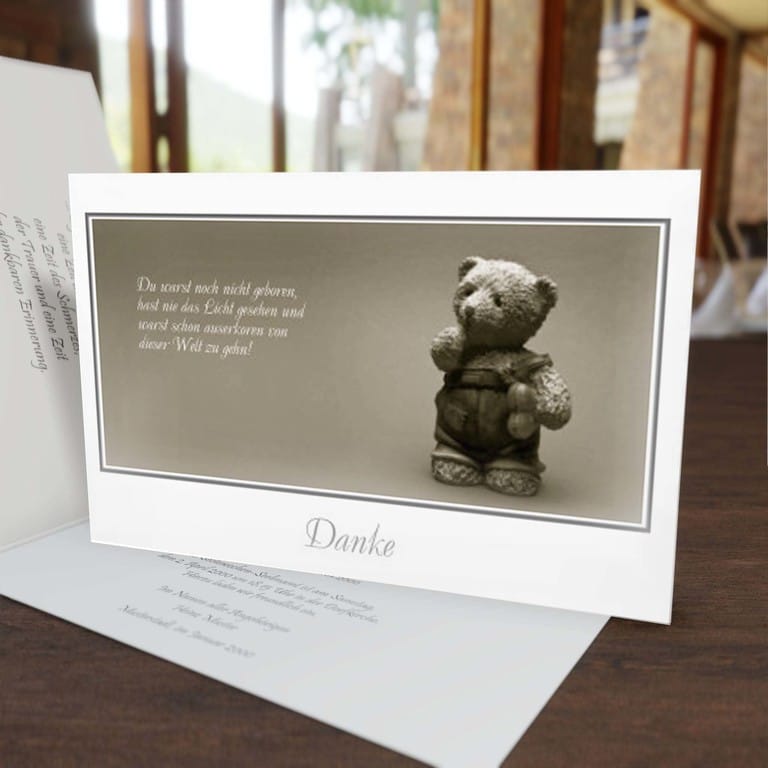 Bedanken Sie sich mit dieser Trauerkarte Danksagung „Teddy“ für die erwiesene Anteilnahme, den Trost und die Unterstützung jeglicher Art in der Zeit der Trauer.