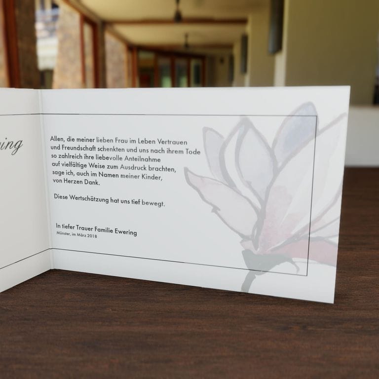Diese Trauerdankkarte ist 4-seitig und wird individuell für Sie in Farbe gedruckt.