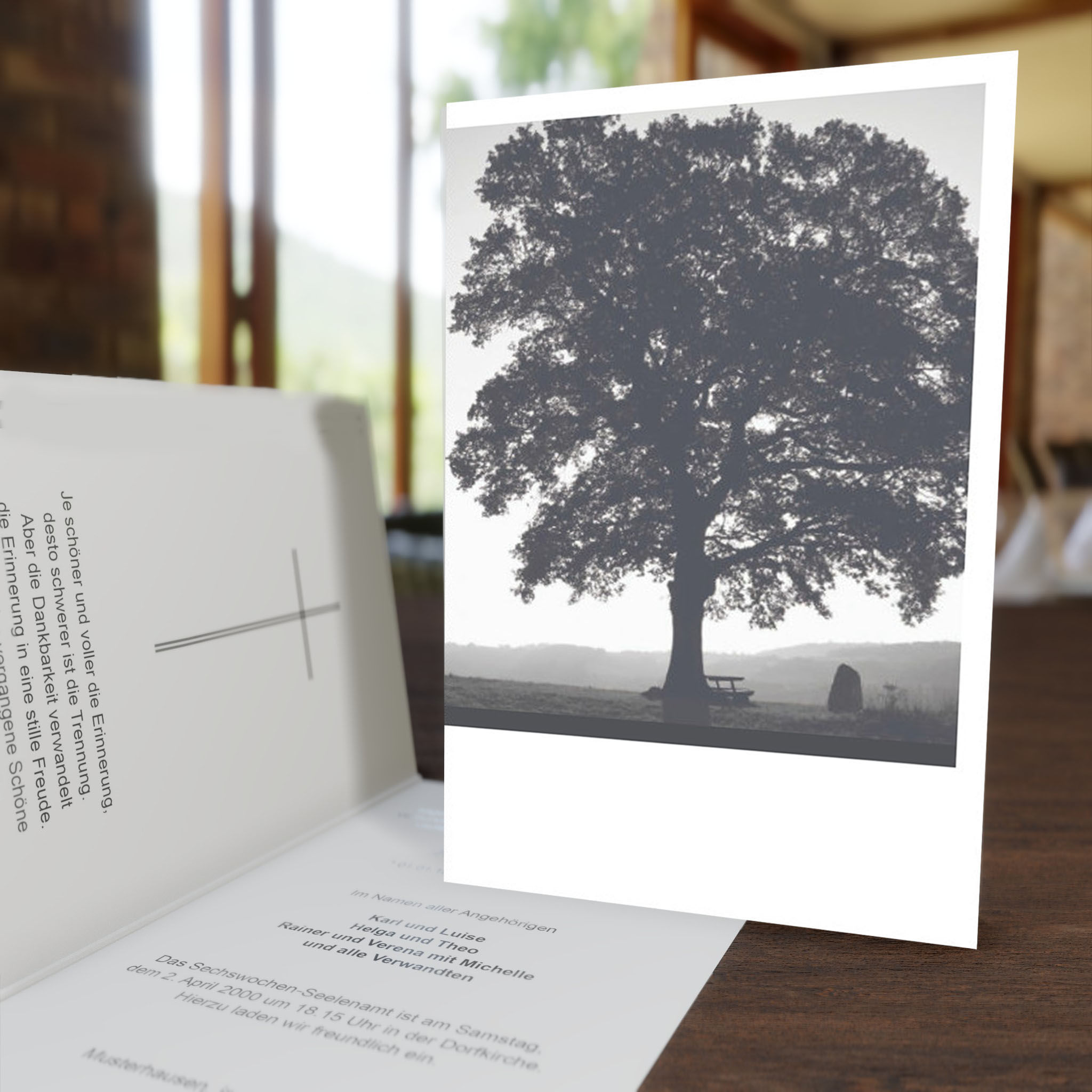 Die Trauerkarte „Baum“ wird geprägt durch einen imposanten Baum, der sich über die gesamte Karte erstreckt. Das in Schwarz und weiß gehaltene Motiv drückt die Traurigkeit über etwas Vergängliches aus, das genauso groß wie der Baum in unserem Leben war - ein Mensch, der uns viel bedeutet hat. Die weite Landschaft im Hintergrund verleiht dem Trauermotiv eine von Traurigkeit erfüllte Stille.