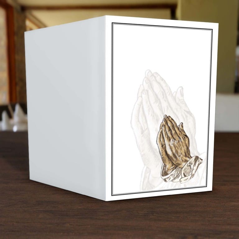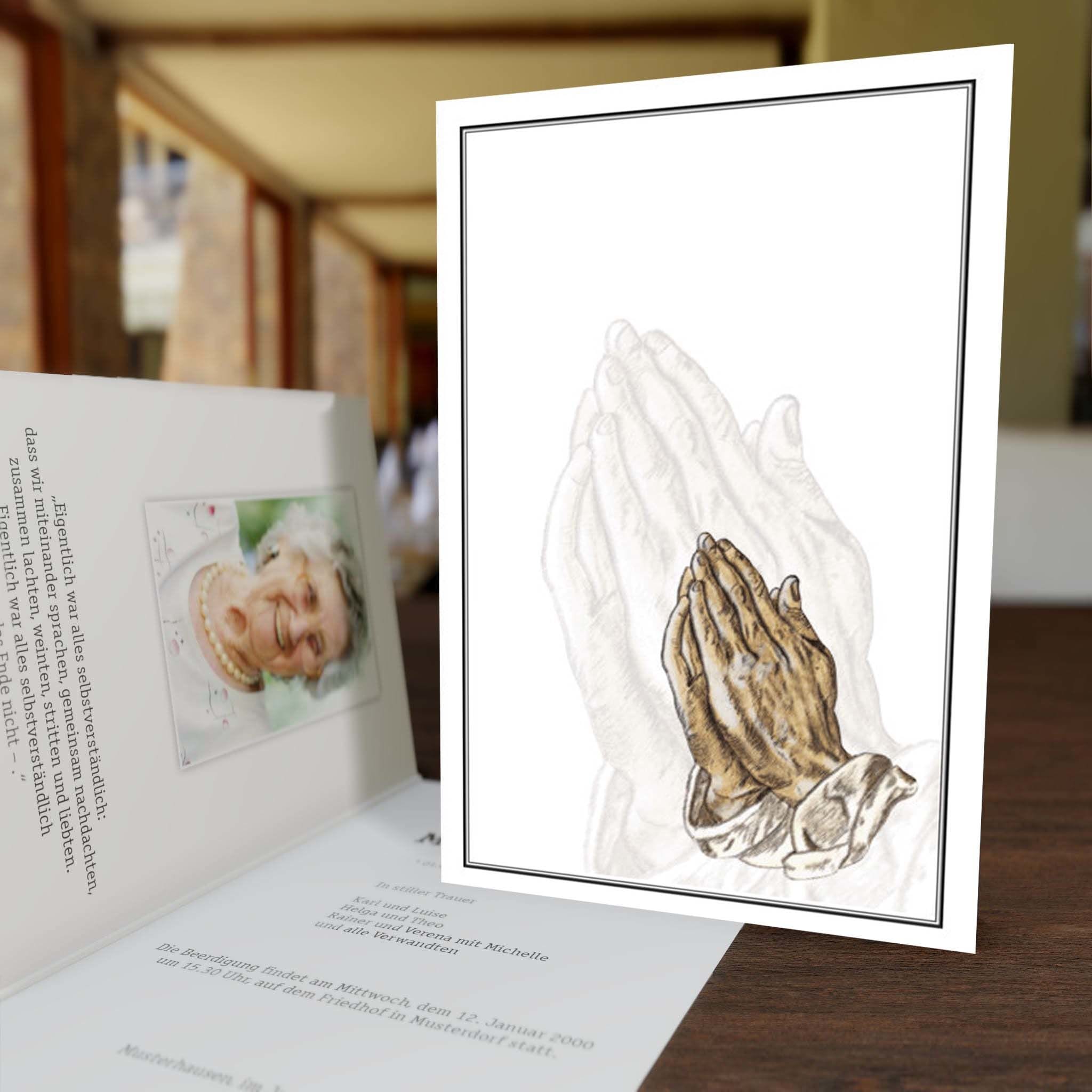 Die Trauerkarte „Betende Hände“ ist ein sehr klassisches und christliches Trauermotiv, angelehnt an das bekannte Gemälde von Albrecht Dürer. Begleitet von einem schwarzen Trauerrahmen, drückt es vor allem das Gebet und die Andacht für den Verstorbenen aus und damit verbunden die Bitte an Gott, den Verstorbenen in sein Reich zu führen.
