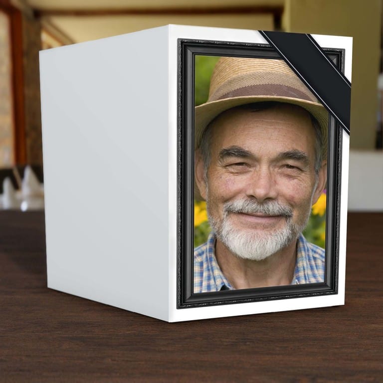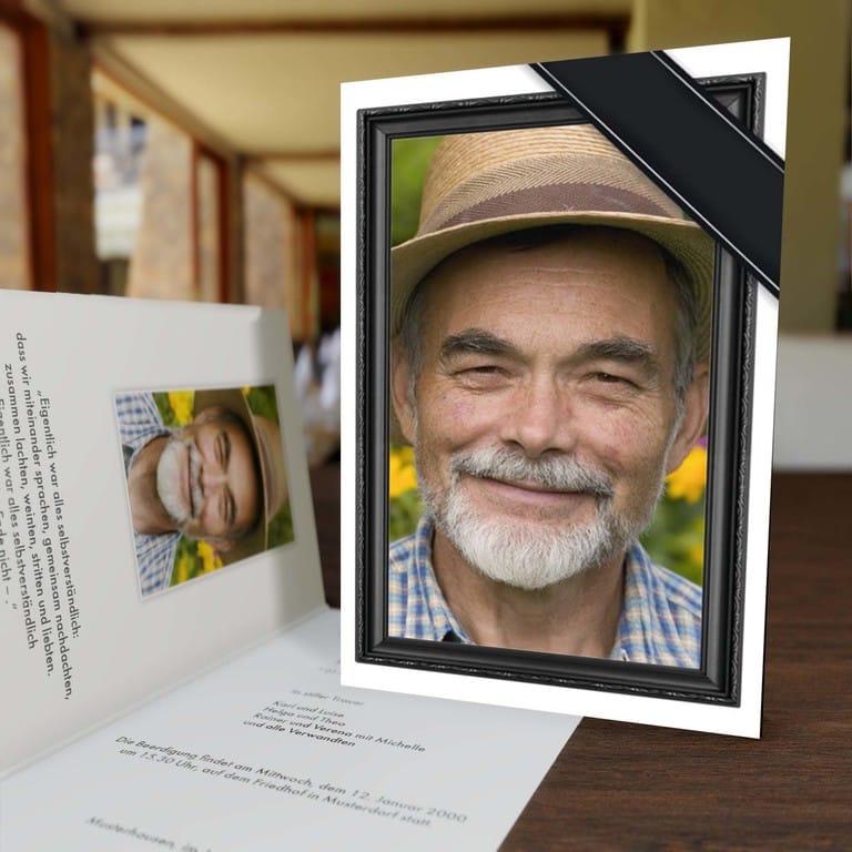 Informieren Sie nahestehende Verwandte und Freunde mit dieser stilvollen Trauer Klappkarte „Fotoklappkarte“ über den eingetretenen Trauerfall und den Termin für die Trauerfeier.