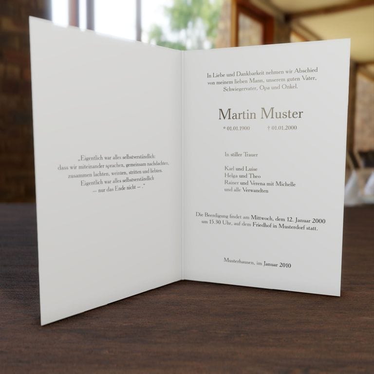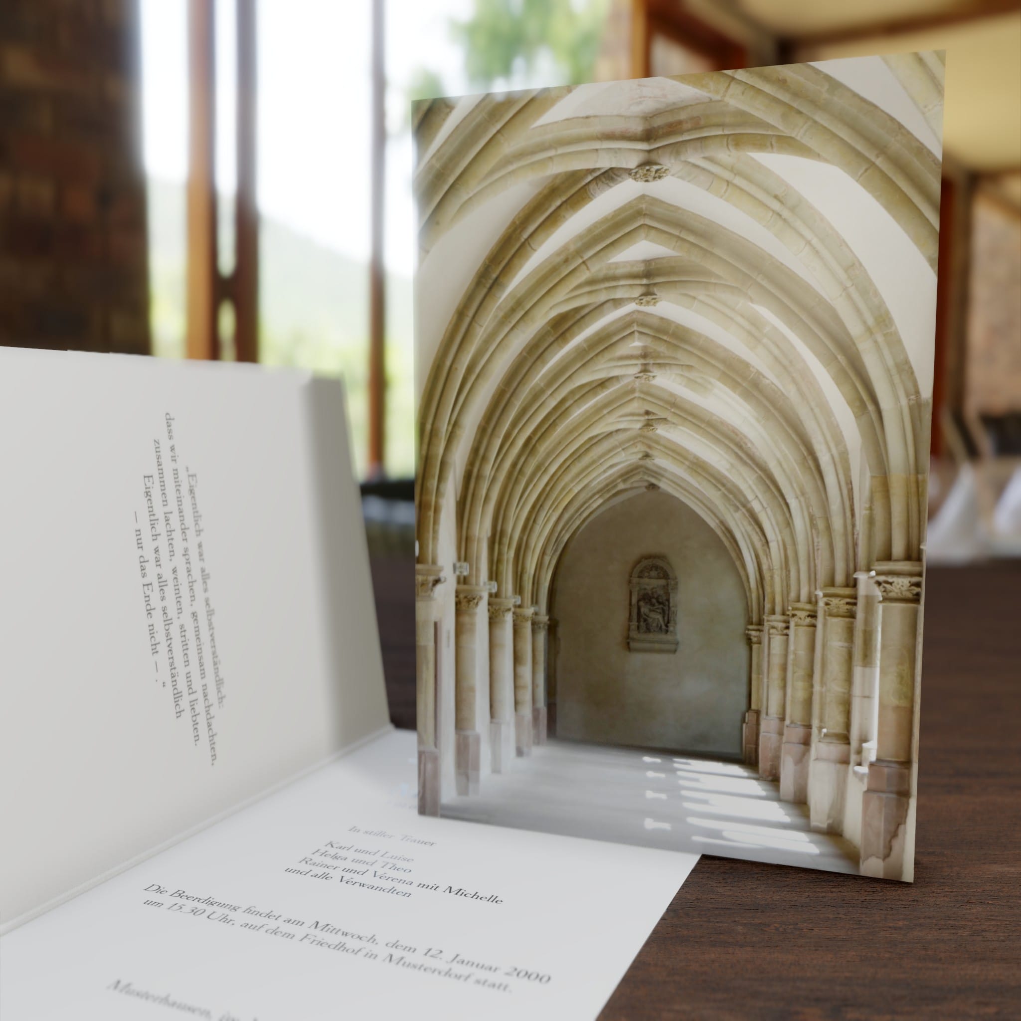 Informieren Sie nahestehende Verwandte und Freunde mit dieser stilvollen Trauer Klappkarte „Gewölbe“ über den eingetretenen Trauerfall und den Termin für die Trauerfeier.