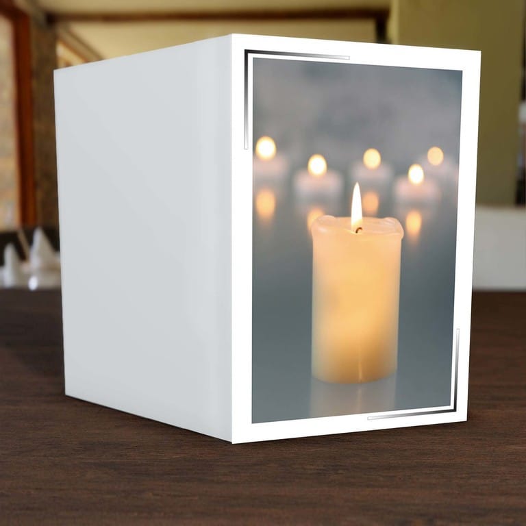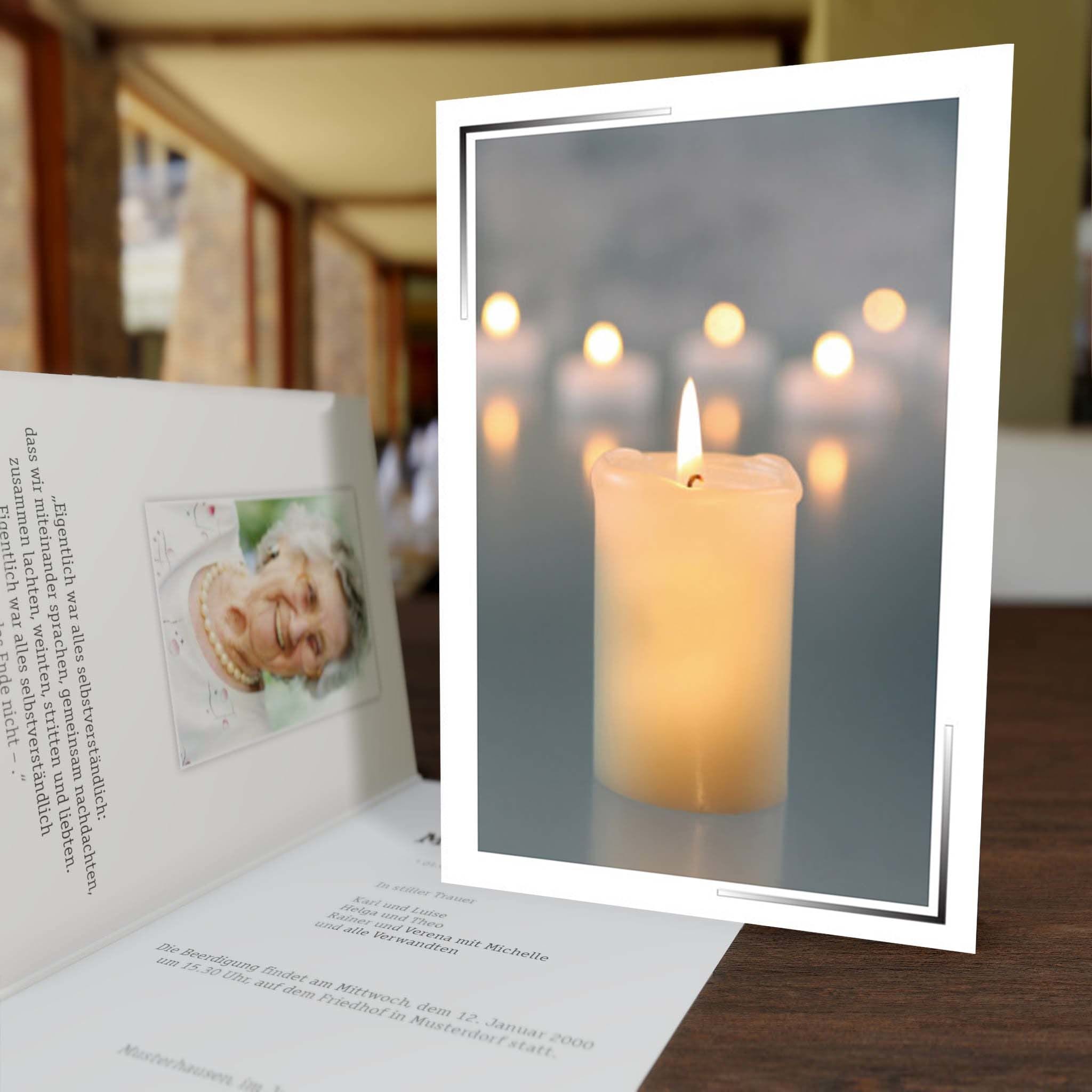 Die im Vordergrund brennende Kerze steht für das stille Gedenken und lässt daran erinnern, dass der Verstorbene nicht vergessen wird, sondern sein Licht in unseren Herzen und Erinnerungen weiterlebt