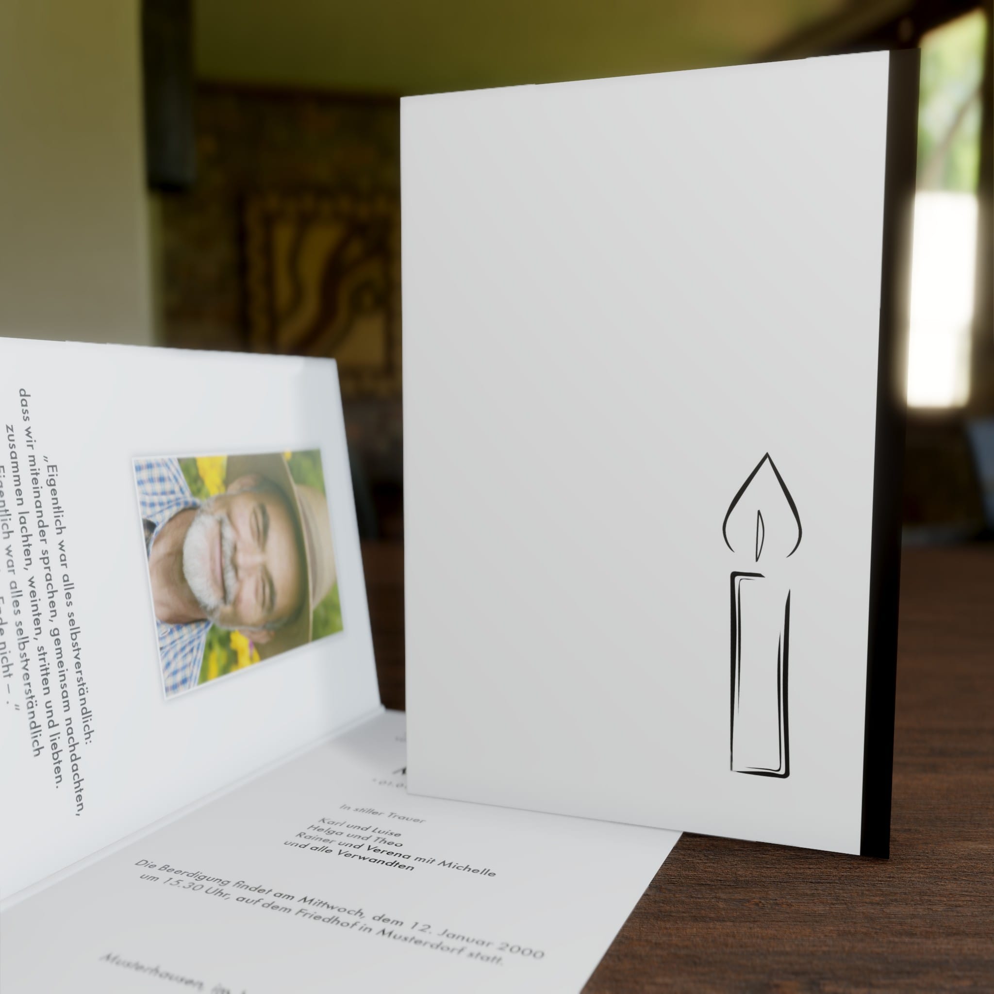 Informieren Sie nahestehende Verwandte und Freunde mit dieser stilvollen Trauer Klappkarte „Kerze Grafik“ über den eingetretenen Trauerfall und den Termin für die Trauerfeier.