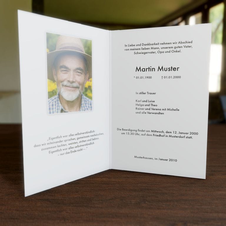 Diese Trauerkarte ist 4-seitig und wird individuell für Sie in Farbe gedruckt.