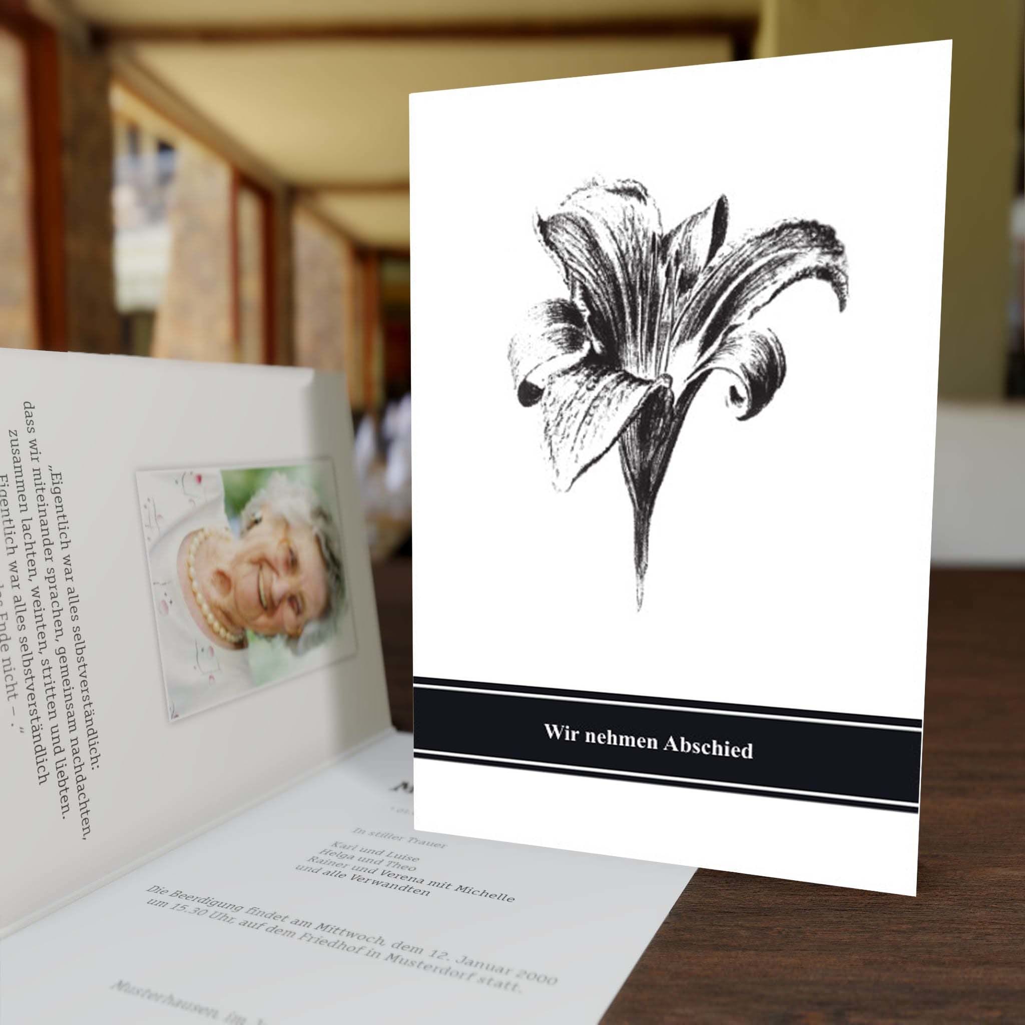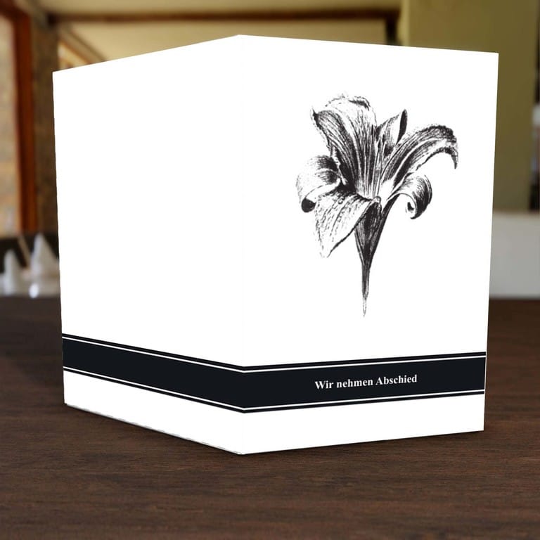 Informieren Sie nahestehende Verwandte und Freunde mit dieser stilvollen Trauer Klappkarte „Lilie“ über den eingetretenen Trauerfall und den Termin für die Trauerfeier.