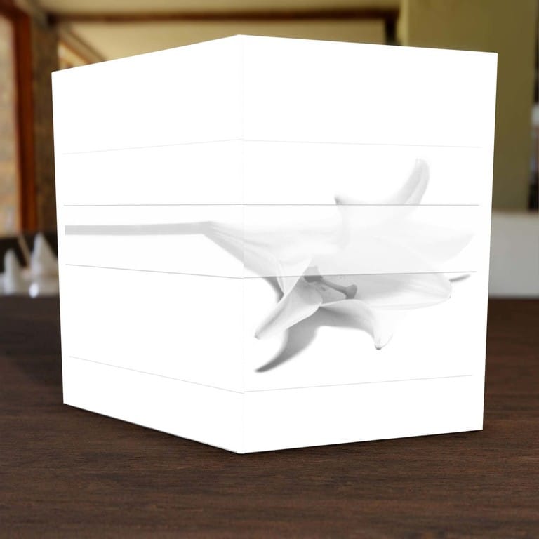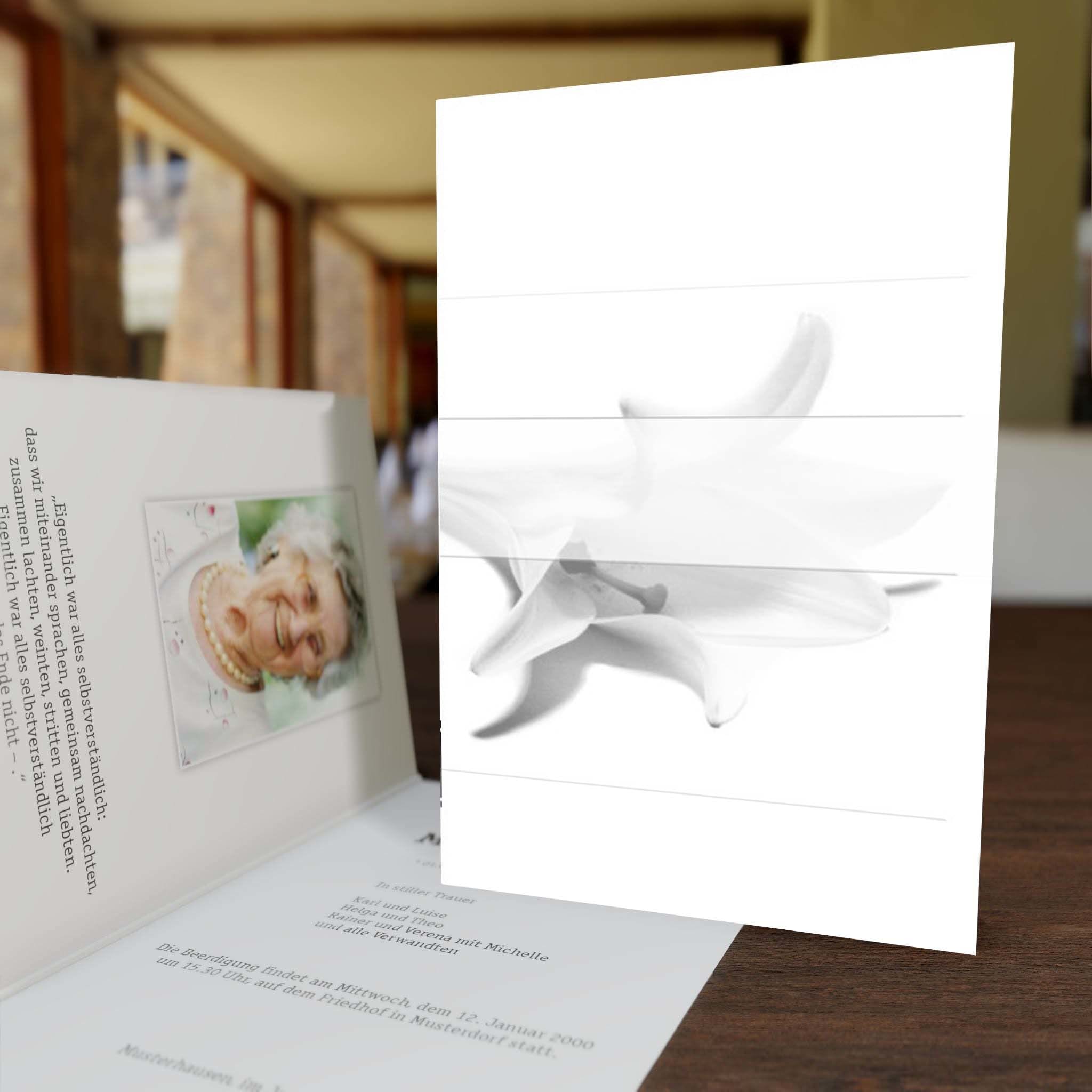 Die Trauerkarte Lilie ist ein besonders ruhiges und sanftes Trauermotiv. Die niedergelegte weiße Lilie symbolisiert die Liebe zum Verstorbenen und hat dabei eine klare und ernste Ausstrahlung. Der leichte Schleier sowie die helle Farbgebung verdeutlichen, dass der Abschied eines geliebten Menschen bevorsteht.