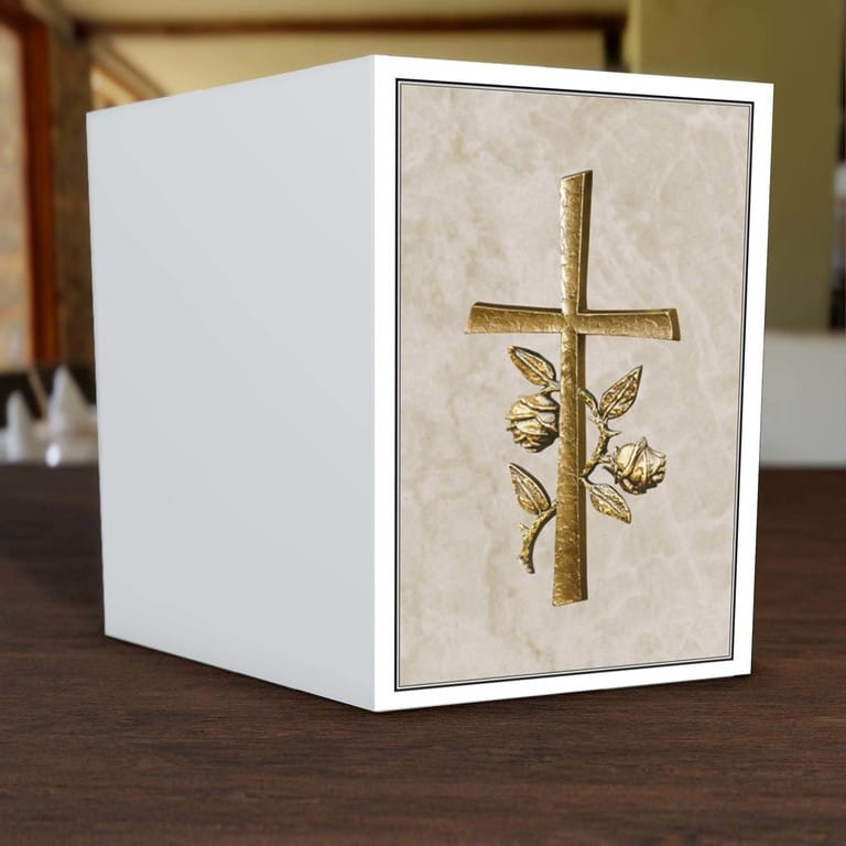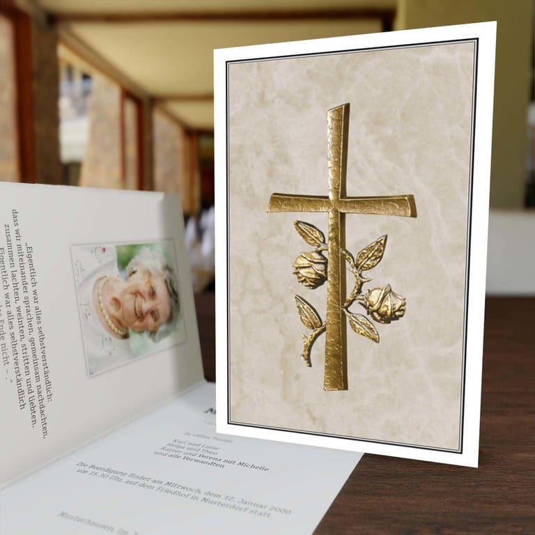 Die Trauerkarte „Messingkreuz“ ist ein klassisches und christliches Trauermotiv, das vor allem die tiefe Trauer der Angehörigen zum Ausdruck bringt. Eine Rose mit Dornen steht für Liebe, aber auch für Schmerz und Leid. In Verbindung mit dem Kreuz kündigt es den schmerzhaften Verlust eines geliebten Menschen an. Dass beide Elemente in dem besonders widerstandsfähigen Material „Messing“ dargestellt werden, symbolisiert die ewige Erinnerung an den Verstorbenen.