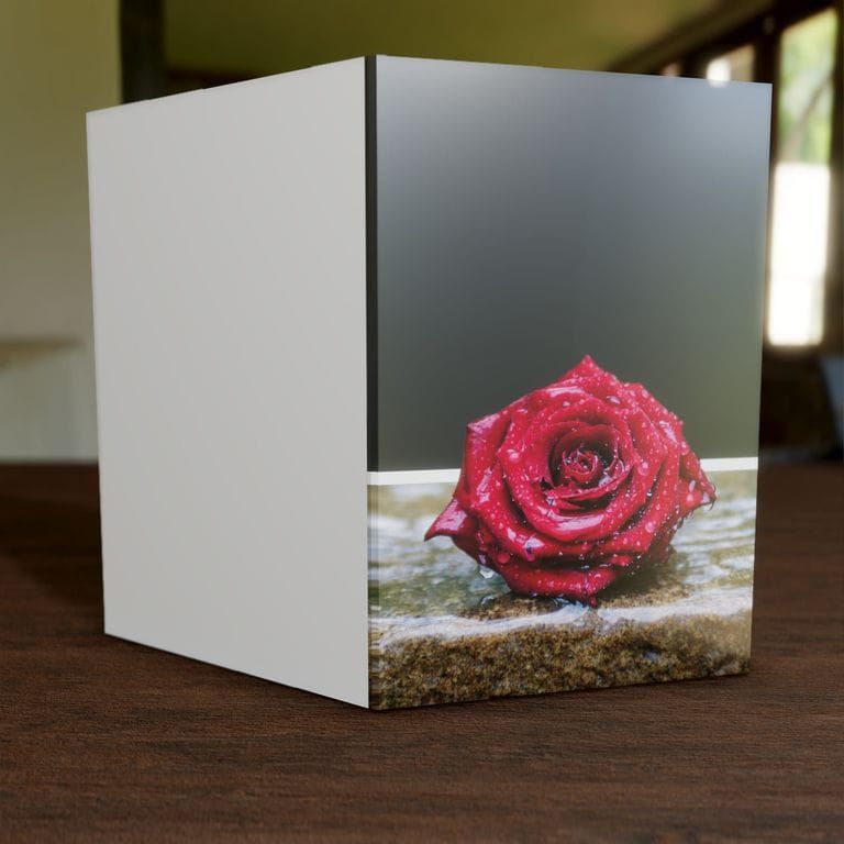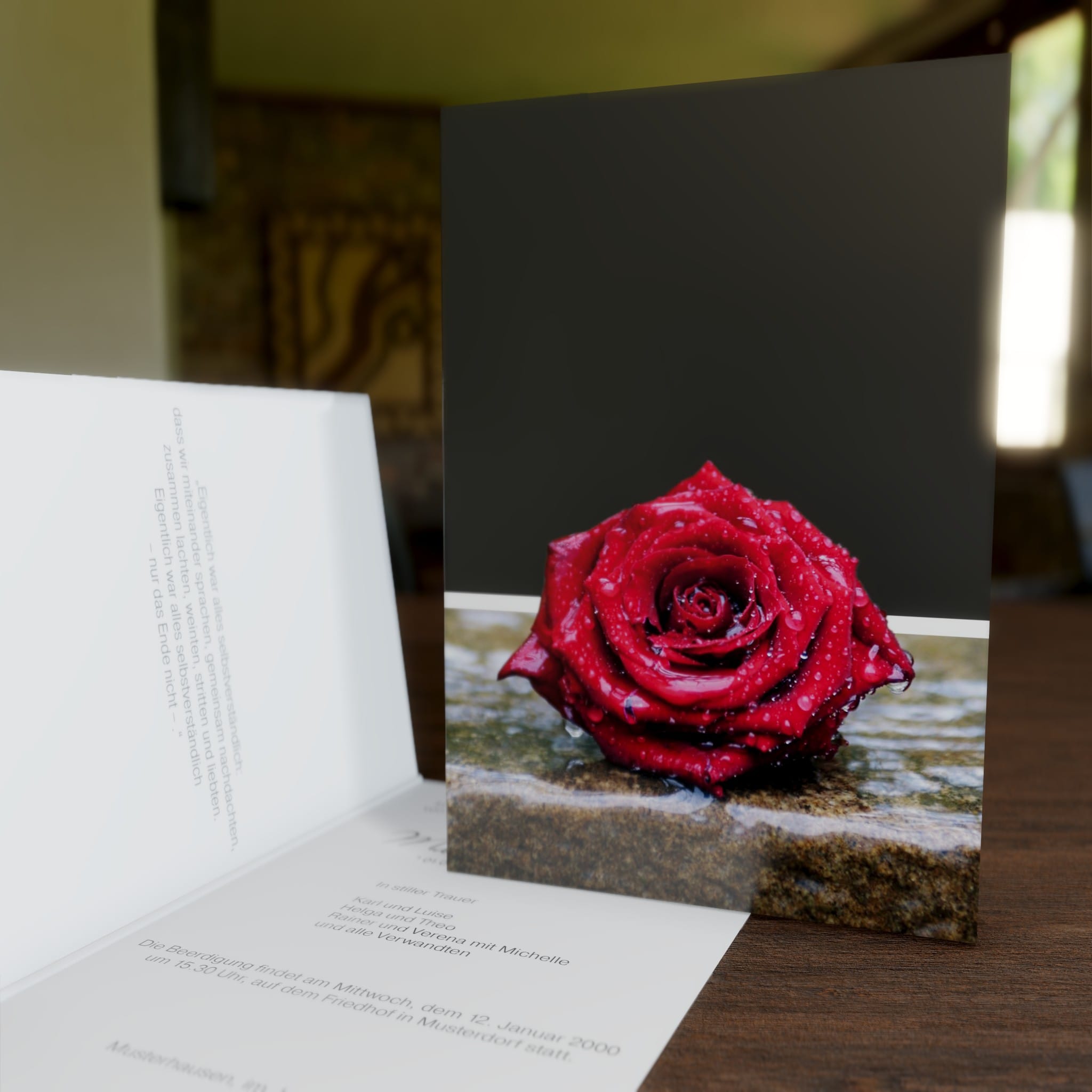 Die Trauerkarte „Regenrose“ stellt eine von Regentropfen bedeckte rote Rose in den Mittelpunkt. Die Rose strahlt und blüht in ihrer vollen Schönheit, umgeben von Tränen und Trübheit. Das Motiv bringt die Trauer über den Verlust eines geliebten Menschen zum Ausdruck, der trotz der Traurigkeit als blühende Erinnerungen im Herzen weiterlebt.