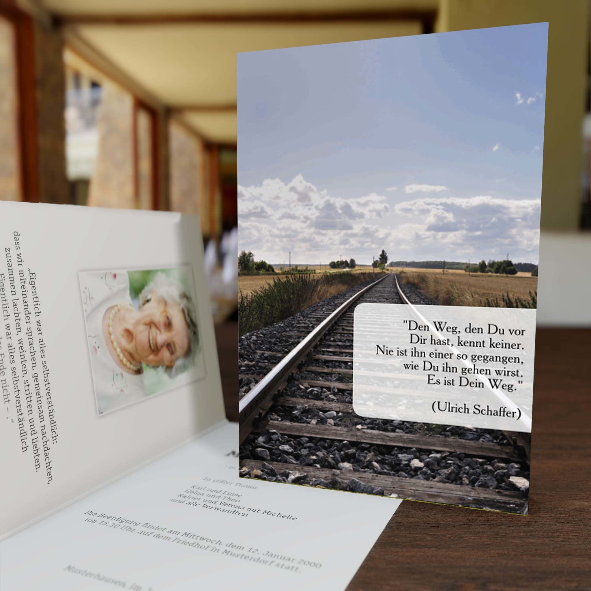 Informieren Sie nahestehende Verwandte und Freunde mit dieser stilvollen Trauer Klappkarte „Schienen“ über den eingetretenen Trauerfall und den Termin für die Trauerfeier.
