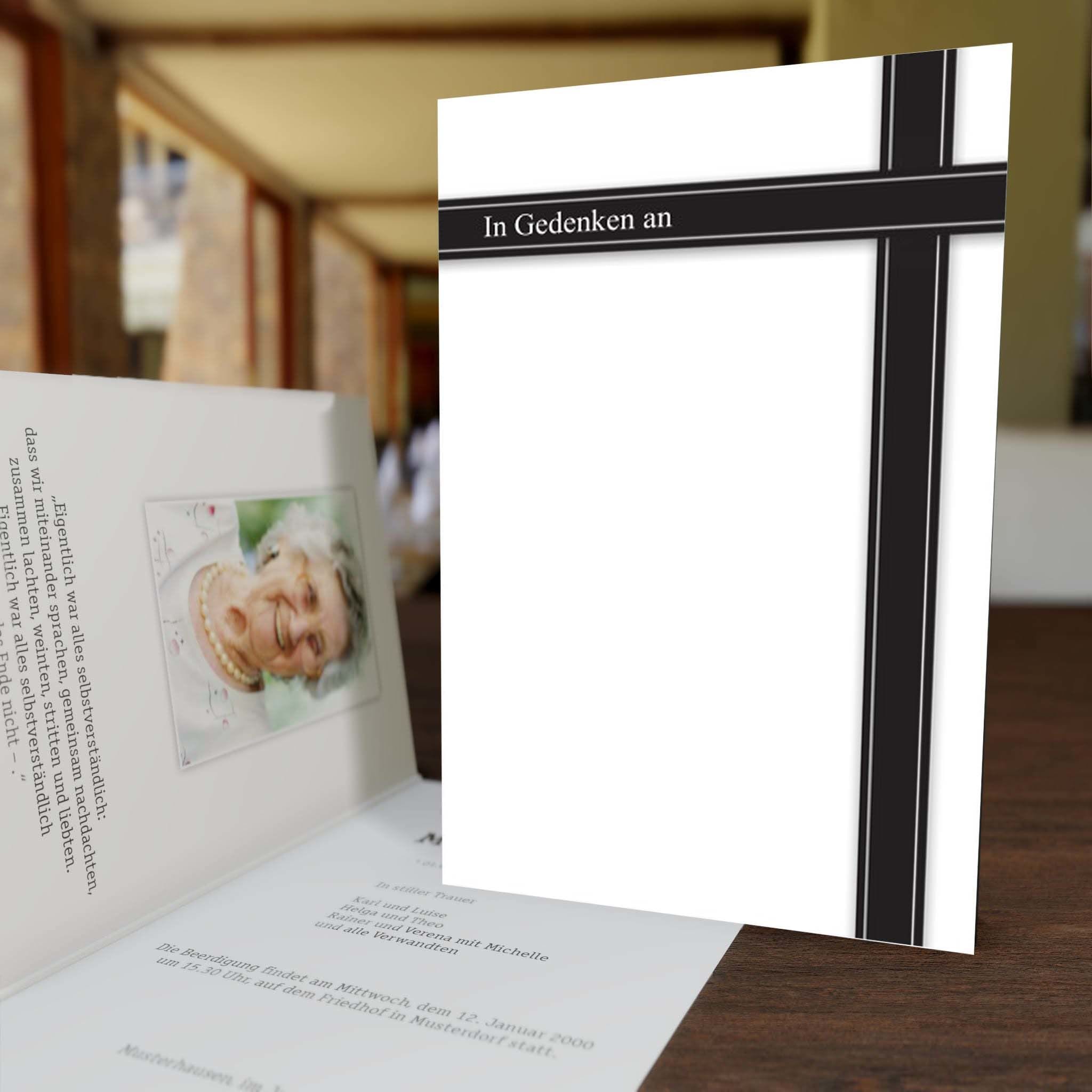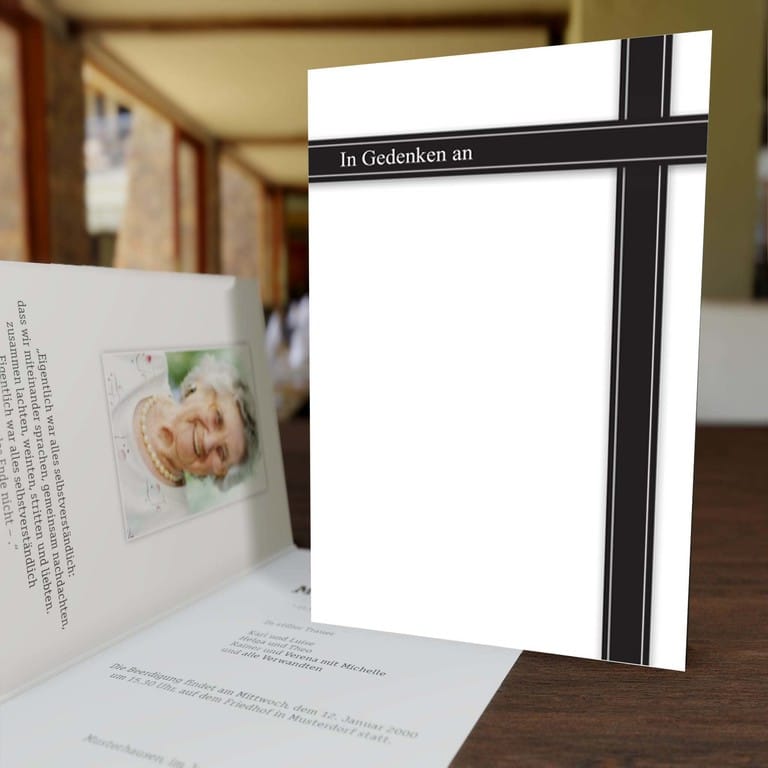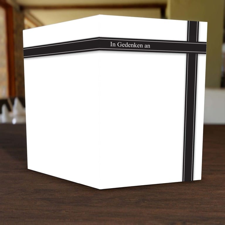 Informieren Sie nahestehende Verwandte und Freunde mit dieser stilvollen Trauer Klappkarte „Schleifenband“ über den eingetretenen Trauerfall und den Termin für die Trauerfeier.