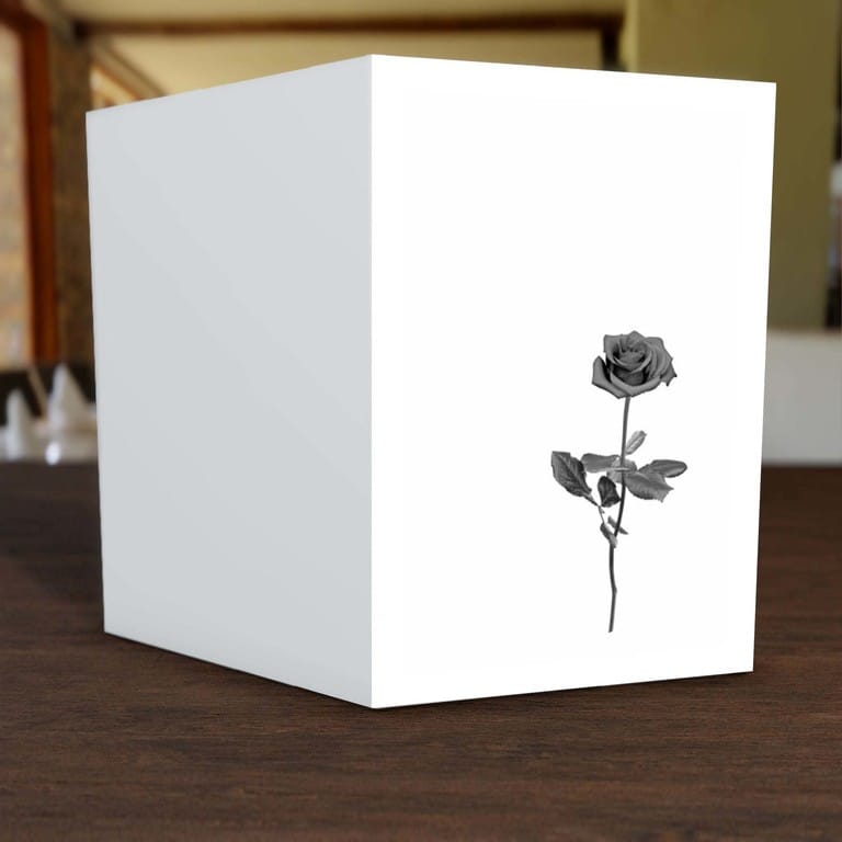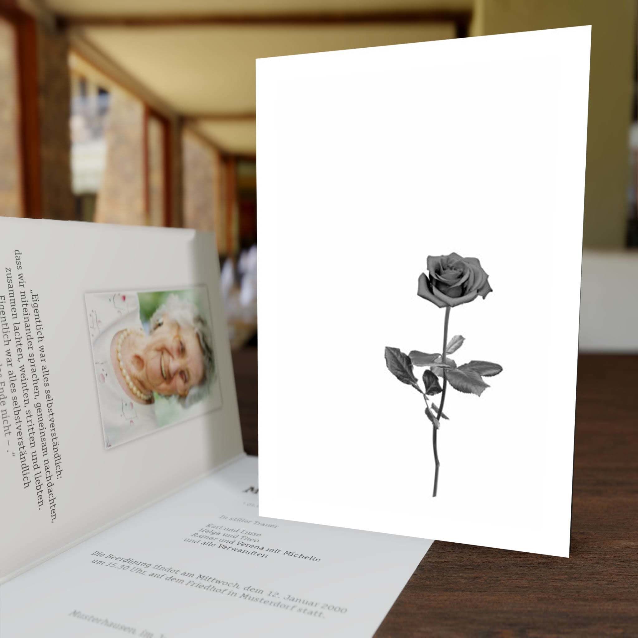 Informieren Sie nahestehende Verwandte und Freunde mit dieser stilvollen Trauer Klappkarte „Stielrose“ über den eingetretenen Trauerfall und den Termin für die Trauerfeier.
