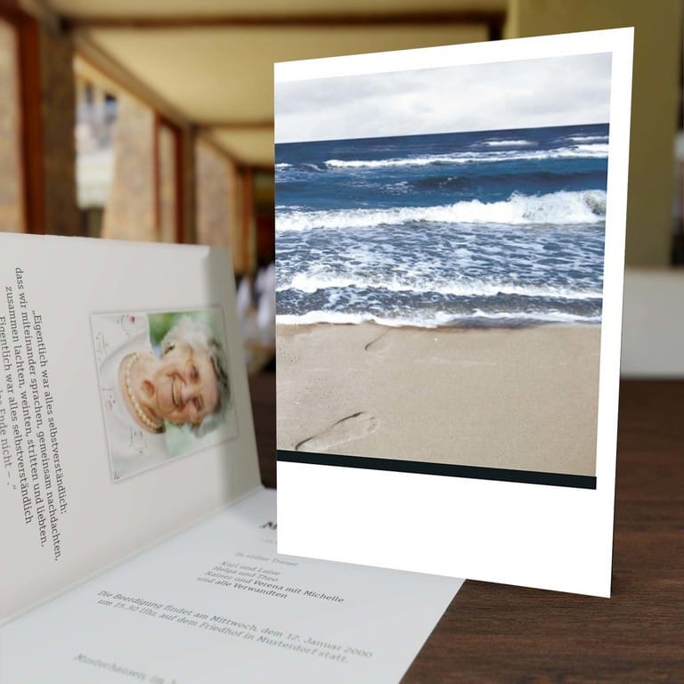 Informieren Sie nahestehende Verwandte und Freunde mit dieser stilvollen Trauer Klappkarte „Strand und Meer“ über den eingetretenen Trauerfall und den Termin für die Trauerfeier.