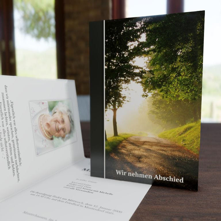 Die Trauerkarte „Waldweg“ ist eines unserer beliebtesten Motive. Das Trauermotiv ist in seiner Farbgebung friedlich und ruhig, was auf viele Angehörige tröstlich wirkt. Die Trauerkarte zeigt einen Waldweg, der in einem warmen, angenehmen Licht endet.