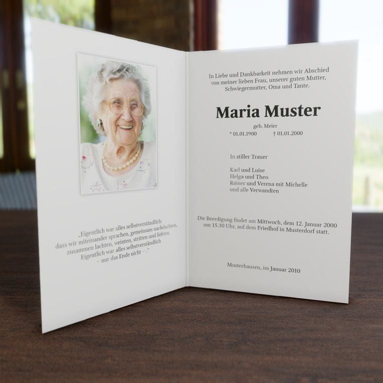 Diese Trauerkarte ist 4-seitig und wird individuell für Sie in Farbe gedruckt.