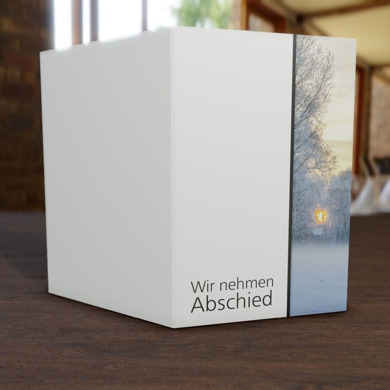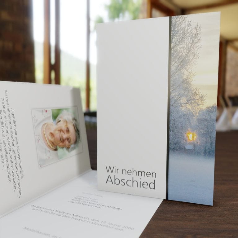 Informieren Sie nahestehende Verwandte und Freunde mit dieser stilvollen Trauer Klappkarte „Wintersonnenaufgang“ über den eingetretenen Trauerfall und den Termin für die Trauerfeier.