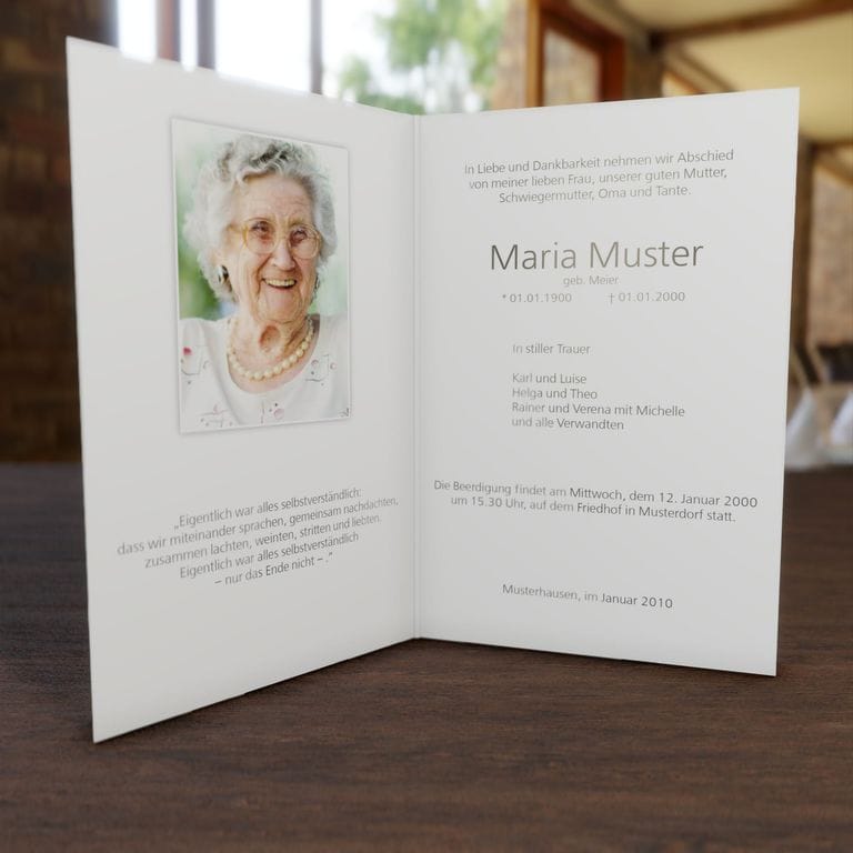 Diese Trauerkarte ist 4-seitig und wird individuell für Sie in Farbe gedruckt.