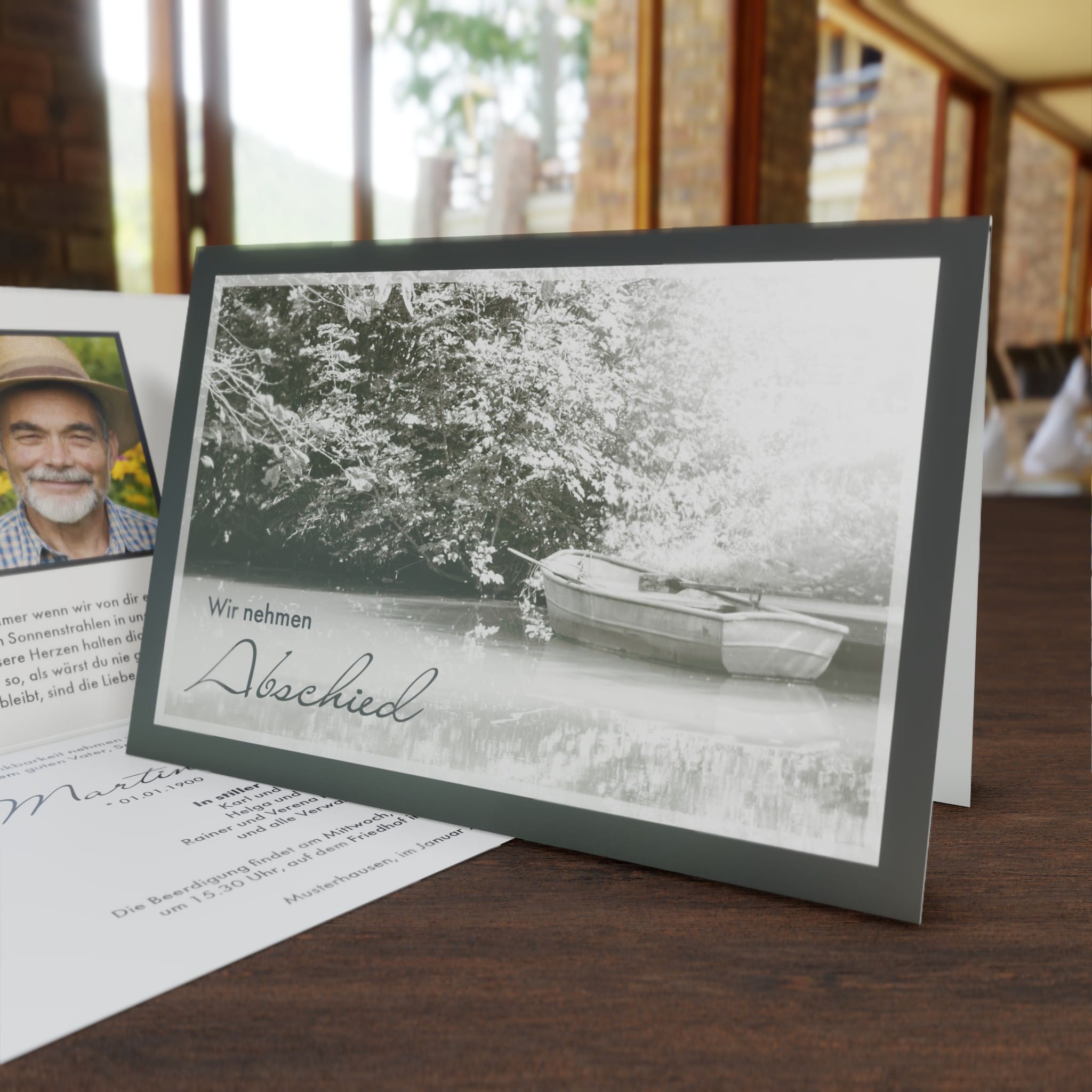 Informieren Sie nahestehende Verwandte und Freunde mit dieser dezenten Trauer Klappkarte „Boot mit Rahmen“ über den eingetretenen Trauerfall und den Termin für die Trauerfeier.
