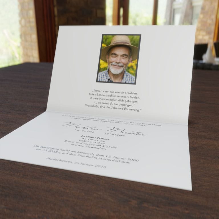 Diese Trauerkarte ist 4-seitig und wird individuell für Sie in Farbe gedruckt.