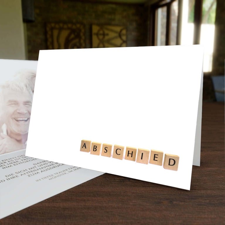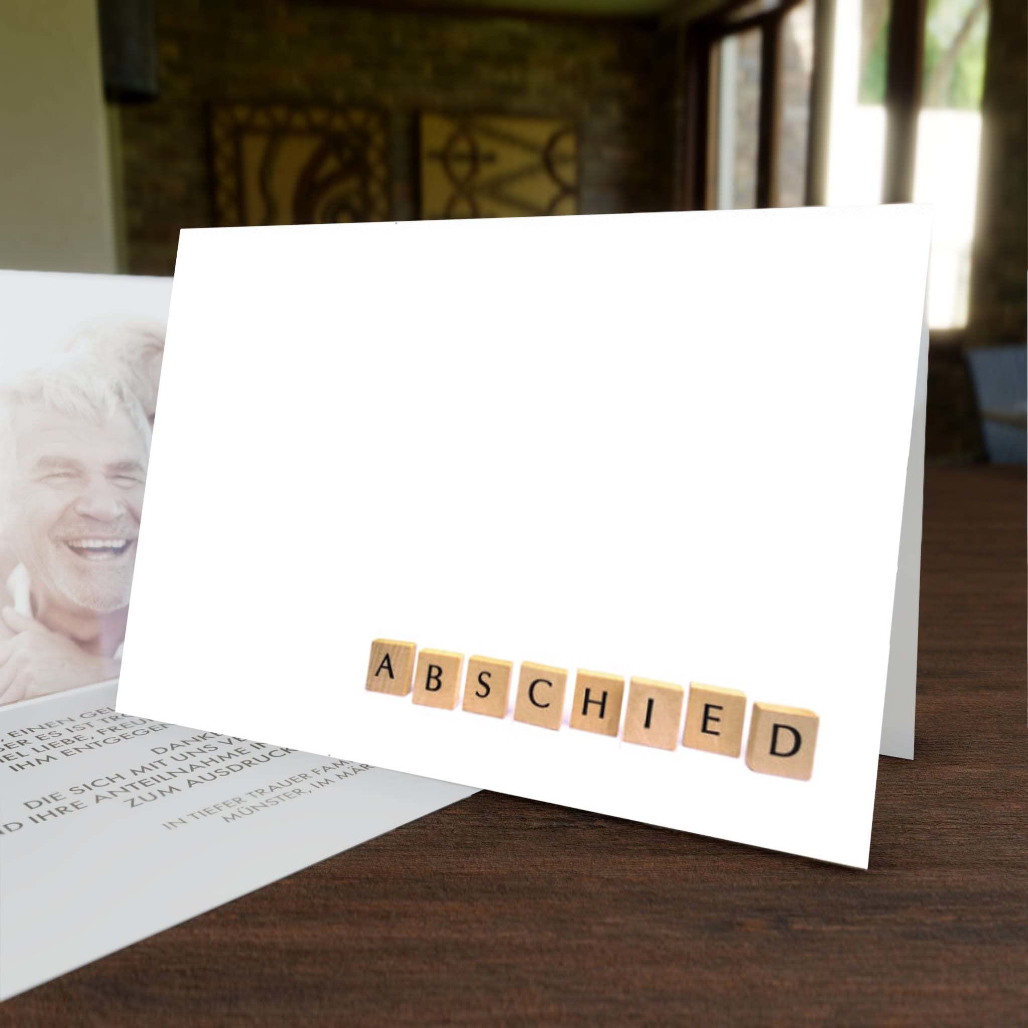 Informieren Sie nahestehende Verwandte und Freunde mit dieser dezenten Trauer Klappkarte „Buchstaben“ über den eingetretenen Trauerfall und den Termin für die Trauerfeier.