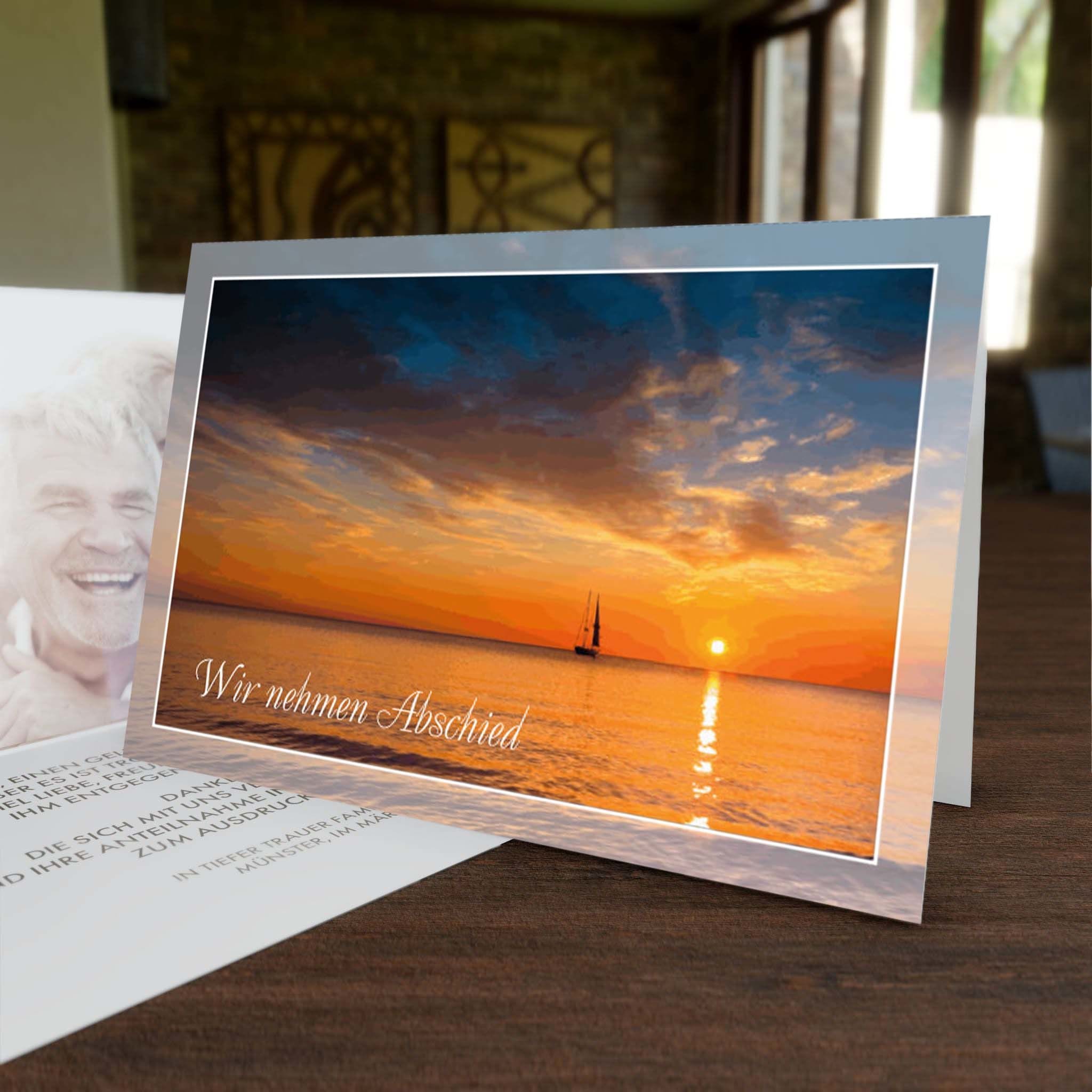 Die Trauerkarte „Segelboot“ besticht durch strahlende Farben und eine idyllische Weite. Das Segelboot hat in dem Motiv seine Reise bereits begonnen und ist im Begriff, mit dem friedlichen Horizont eins zu werden. Das Trauermotiv weckt als Betrachter das Bedürfnis, dem Boot zum Abschied zu winken und durch die friedliche Stimmung, die das Trauerkartenmotiv „Segelboot“ vermittelt, entsteht ein tröstliches Gefühl.