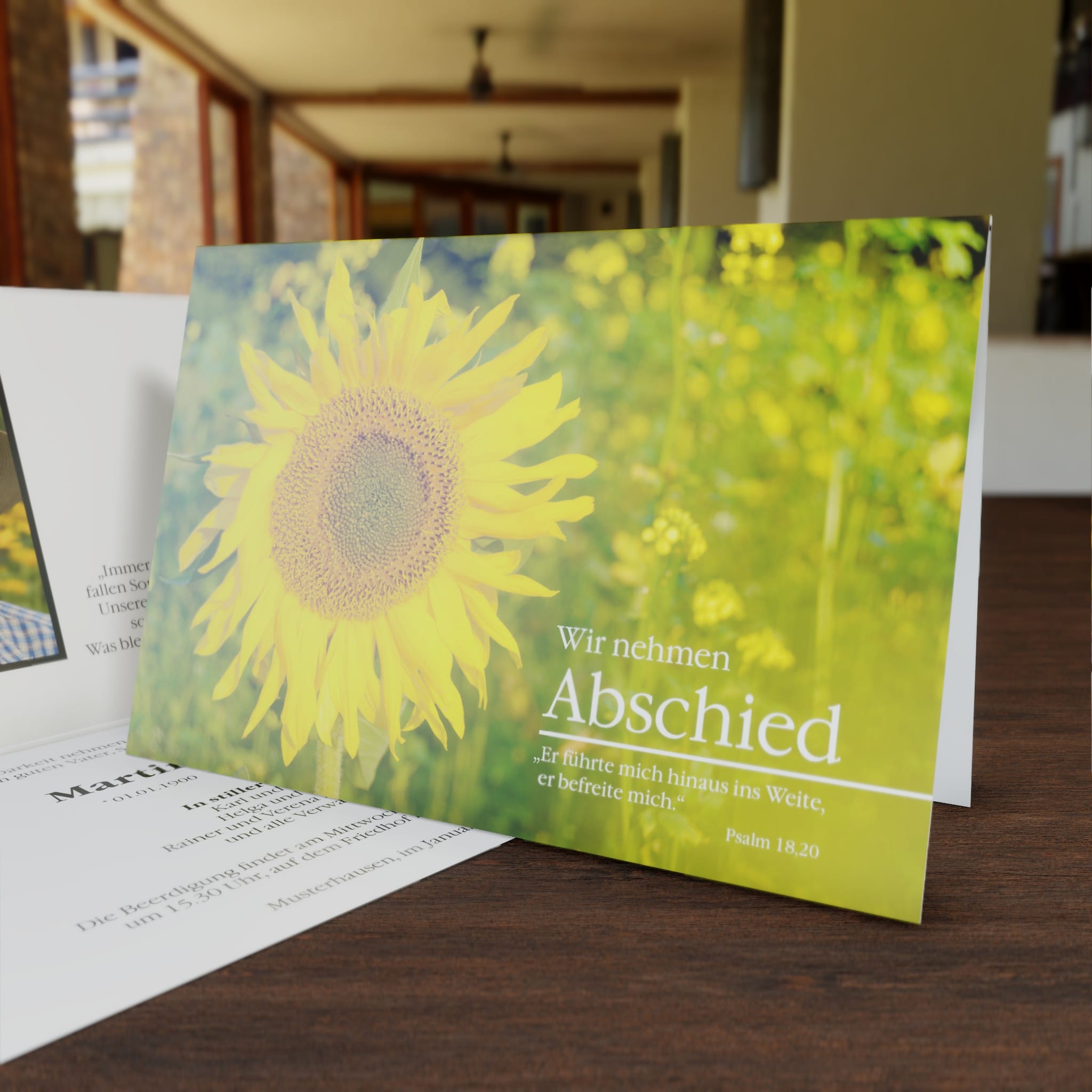 Informieren Sie nahestehende Verwandte und Freunde mit dieser dezenten Trauer Klappkarte „Sonnenblume“ über den eingetretenen Trauerfall und den Termin für die Trauerfeier.