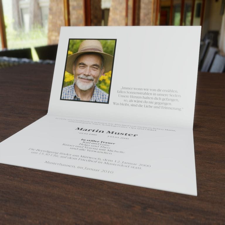Diese Trauerkarte ist 4-seitig und wird individuell für Sie in Farbe gedruckt.