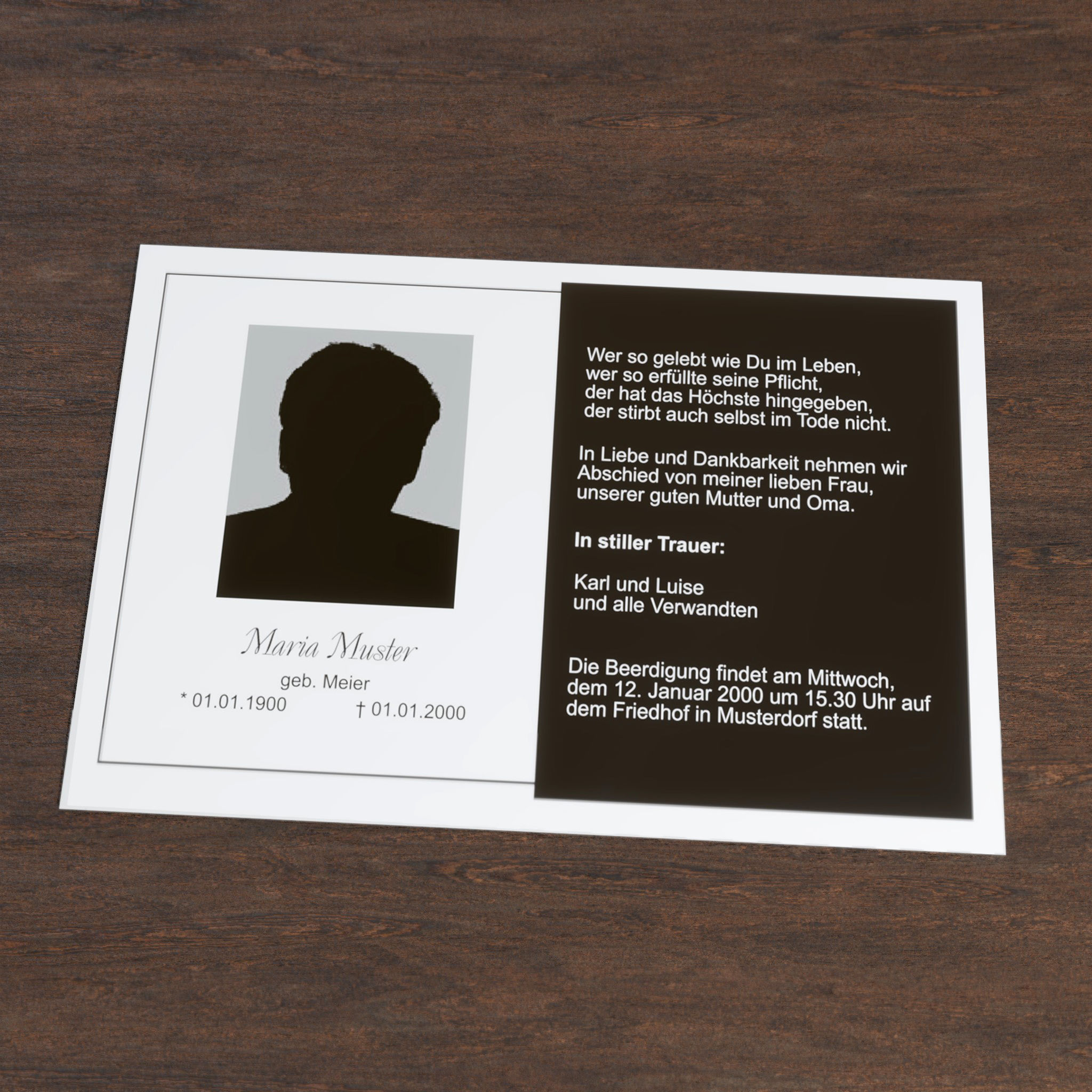 Stilvolle Trauerkarte mit dem Motiv Fotokarte im klassischen einseitigem Querformat. Informieren Sie nahestehende Verwandte und Freunde mit dieser Klappkarte „Fotokarte“ über den eingetretenen Trauerfall und den Termin für die Trauerfeier.