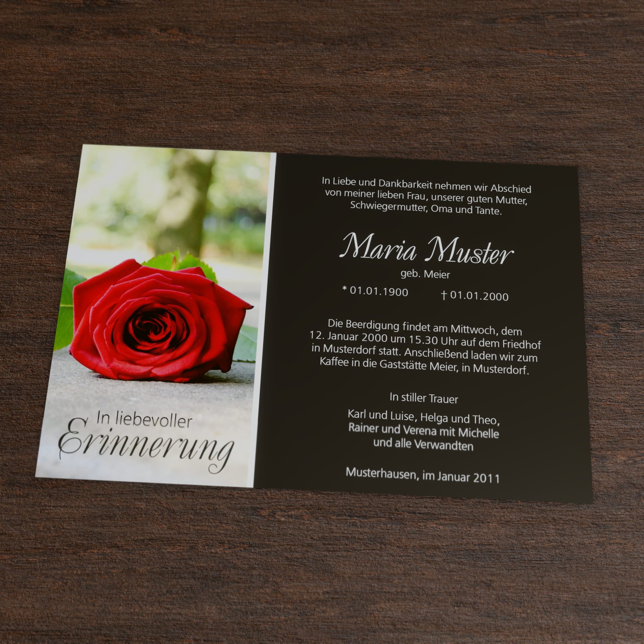 Stilvolle Trauerkarte mit dem Motiv liegende Rose im klassischen einseitigem Querformat. Informieren Sie nahestehende Verwandte und Freunde mit dieser Klappkarte „Liegende Rose“ über den eingetretenen Trauerfall und den Termin für die Trauerfeier.