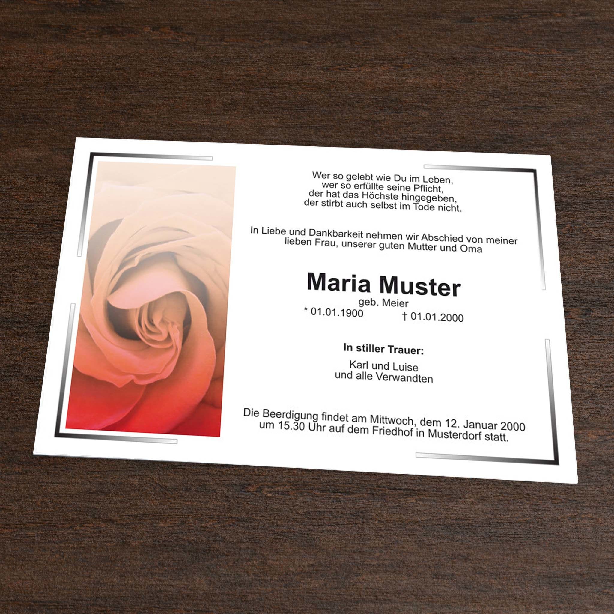 Stilvolle Trauerkarte mit dem Motiv "Sanfte Rose" im klassischen einseitigem Querformat. Informieren Sie nahestehende Verwandte und Freunde mit dieser Klappkarte „Sanfte Rose“ über den eingetretenen Trauerfall und den Termin für die Trauerfeier.