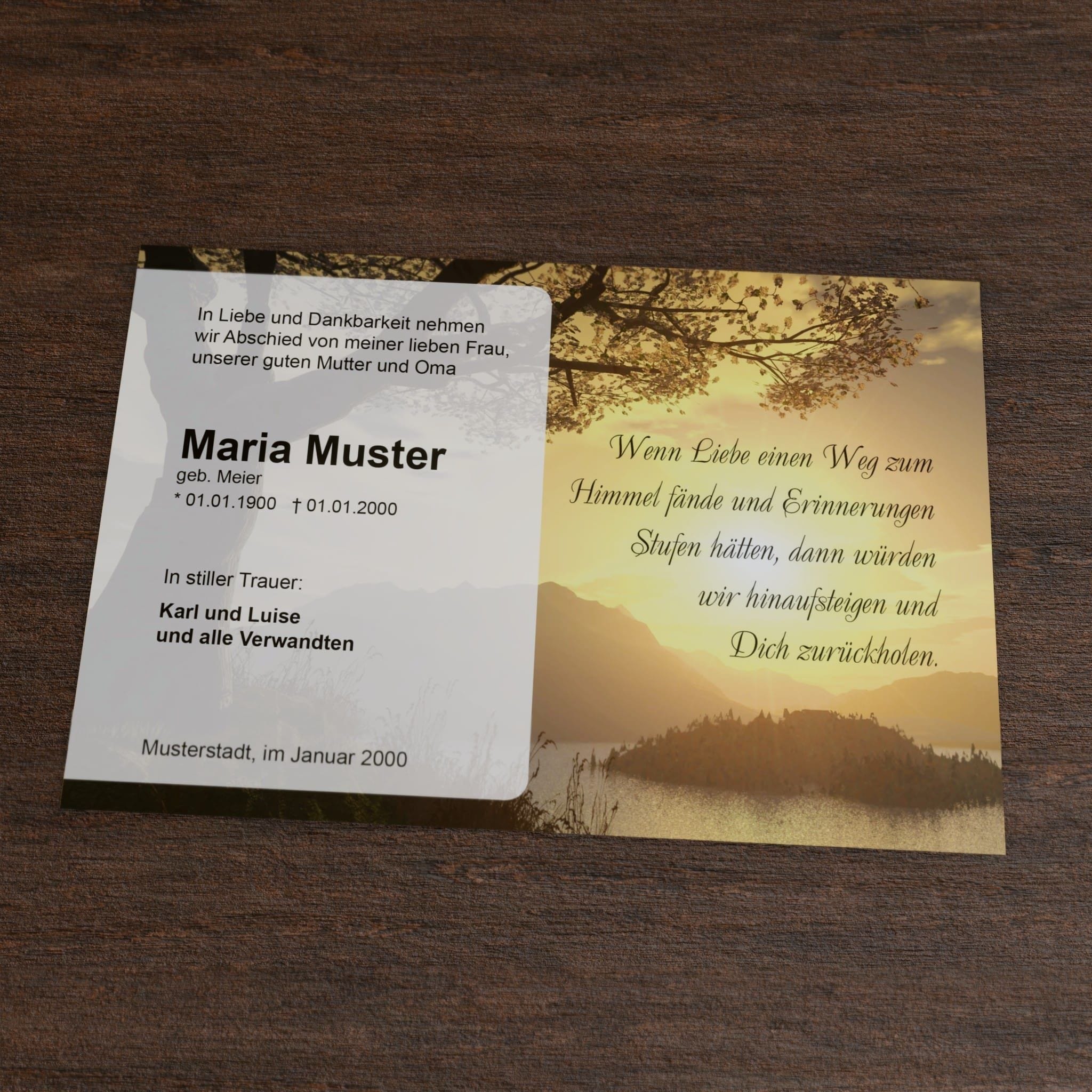 Stilvolle Trauerkarte mit dem Motiv Sonnenuntergang Baum im klassischen einseitigem Querformat. Informieren Sie nahestehende Verwandte und Freunde mit dieser Klappkarte „Sonnenuntergang Baum“ über den eingetretenen Trauerfall und den Termin für die Trauerfeier.