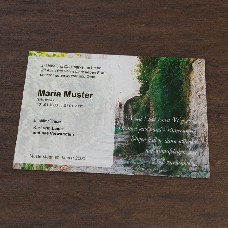 Diese Trauerkarte ist 2-seitig und wird individuell für Sie in Farbe gedruckt.